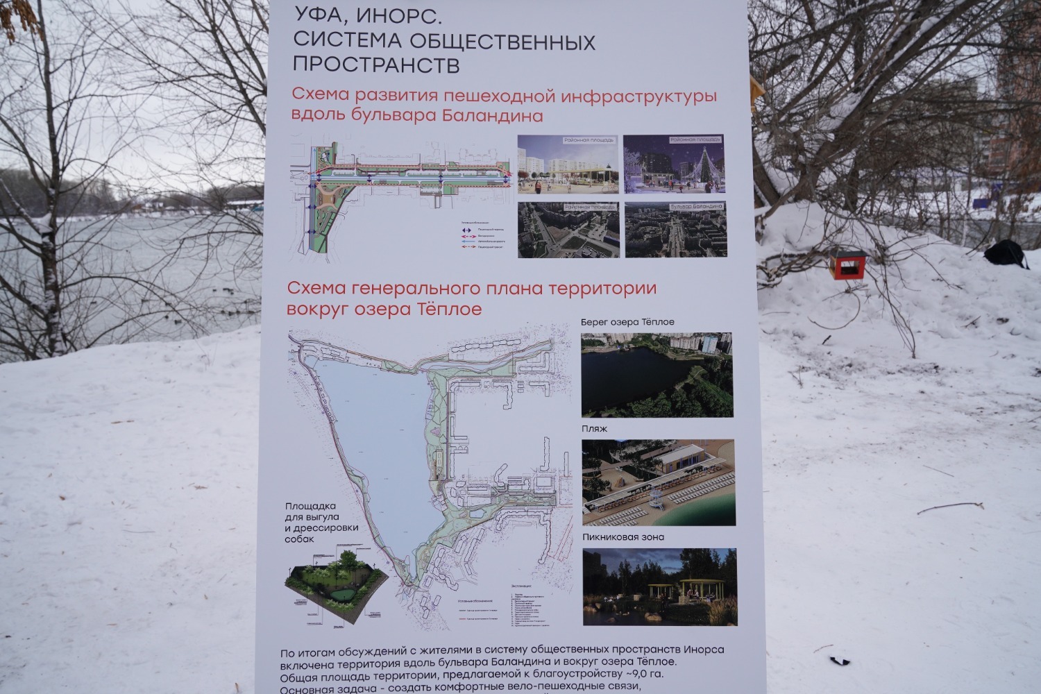 Вокруг озера предложены вело-пешеходные маршруты, понтонные пирсы и площадки отдыха у воды, зона для пикников, площадка для выгула и тренировки собак, реорганизация пляжной территории.