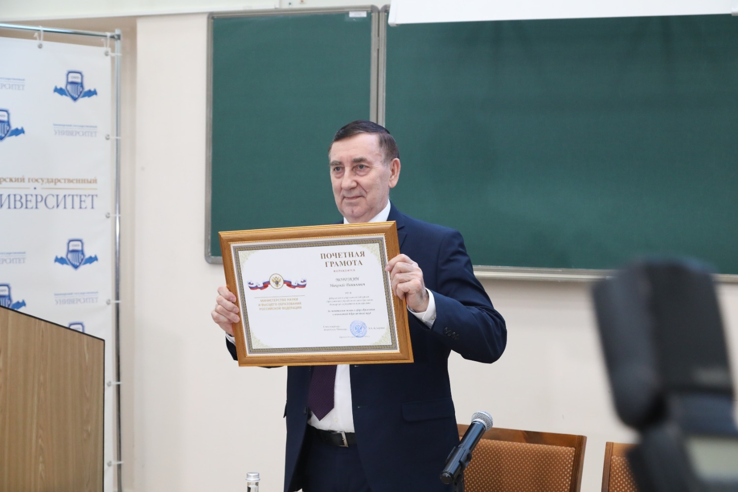 Заместитель министра науки и высшего образования России Пётр Кучеренко также поблагодарил бывшего ректора Башкирского государственного университета Николая Морозкина и вручил ему ведомственную почётную грамоту.