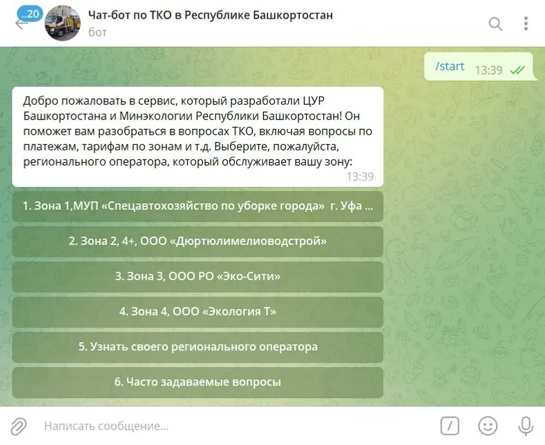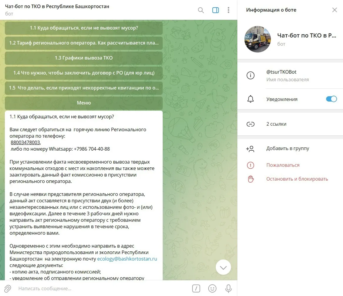 Центр управления Республики Башкортостан и Минэкологии РБ разработали чат-бот, с помощью которого можно получить ответы на самые актуальные вопросы по ТКО.