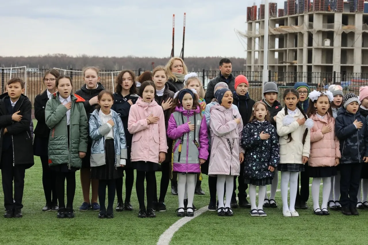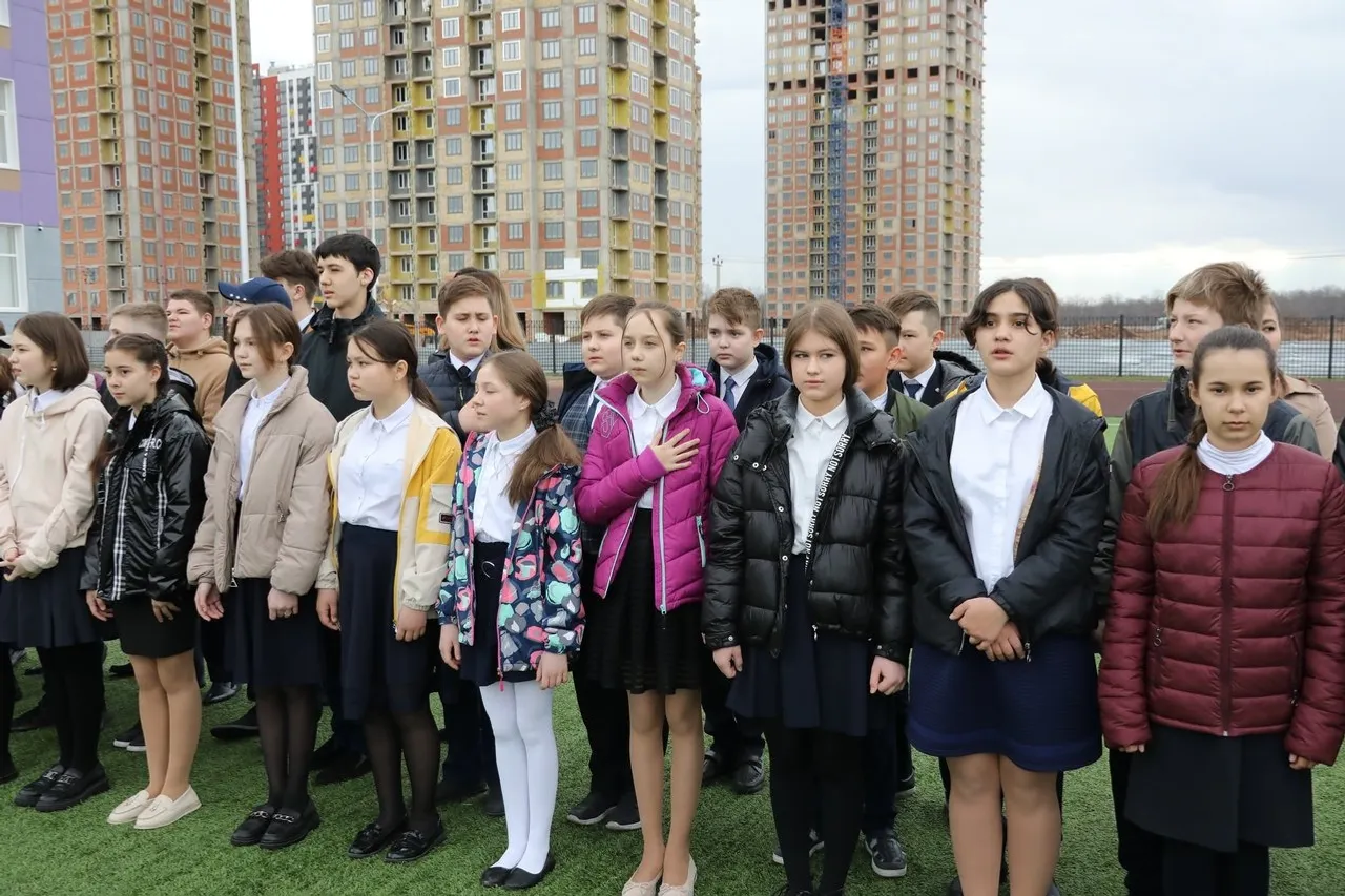 Перед уроками ученики школы построились во дворе, где под звуки гимна главные символы страны и республики взмыли вверх.
