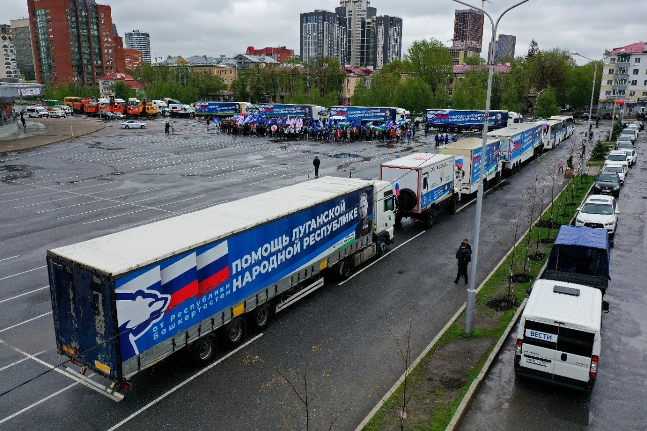 Сегодня из Уфы на Донбасс отправился седьмой конвой с гуманитарным грузом для жителей Луганской народной республики. Общий вес груза составляет более 167 тонн. В его составе: 61 тонна строительных и пиломатериалов, почти три тонны медицинского оборудования и лекарственных препаратов, 30 тонн оборудования для благоустройства дворов и улиц, 70 тонн холодного асфальта, продовольствие, канцтовары, хозяйственные товары. Всего в составе колонны 41 единица техники и 133 человека.