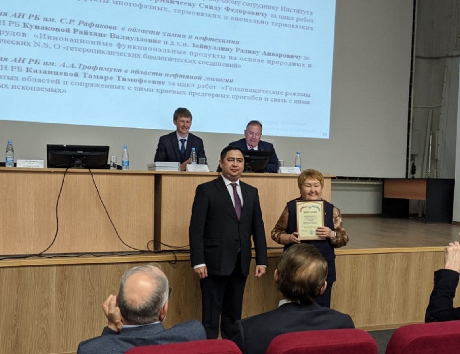 Премию АН РБ им. А.А. Трофимука в области нефтяной геологии получила академик АН РБ Казанцева Тамара Тимофеевна за цикл работ «Геодинамические режимы складчатых областей и сопряженных с ними краевых предгорных прогибов и связь с ними полезных ископаемых».