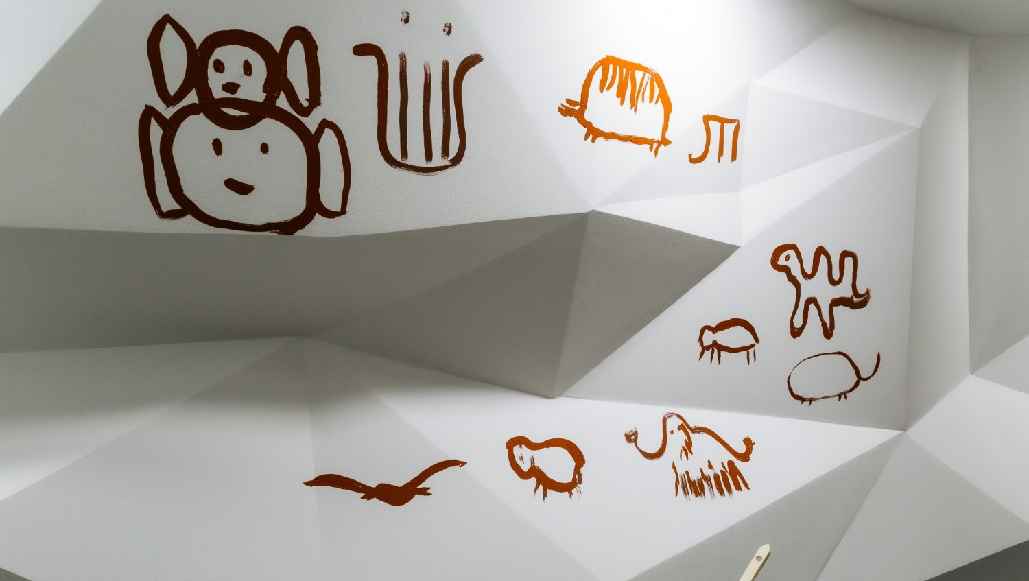 Создатели комнаты-«рисовашки» при изготовлении игрушечного макета пещеры вдохновились главными экспонатами музея — копиями панно с наскальной живописью, которые обрамлены полигональной фигурой. Так, в центре комнаты «вырос» айсберг — белоснежный объем. В экспозиционном зале эти фигуры в сером исполнении. Для класса же выбран белый цвет, поскольку белоснежный макет игральной пещеры виден издалека, к тому же на белом рисунки из охры будут контрастно выделяться.