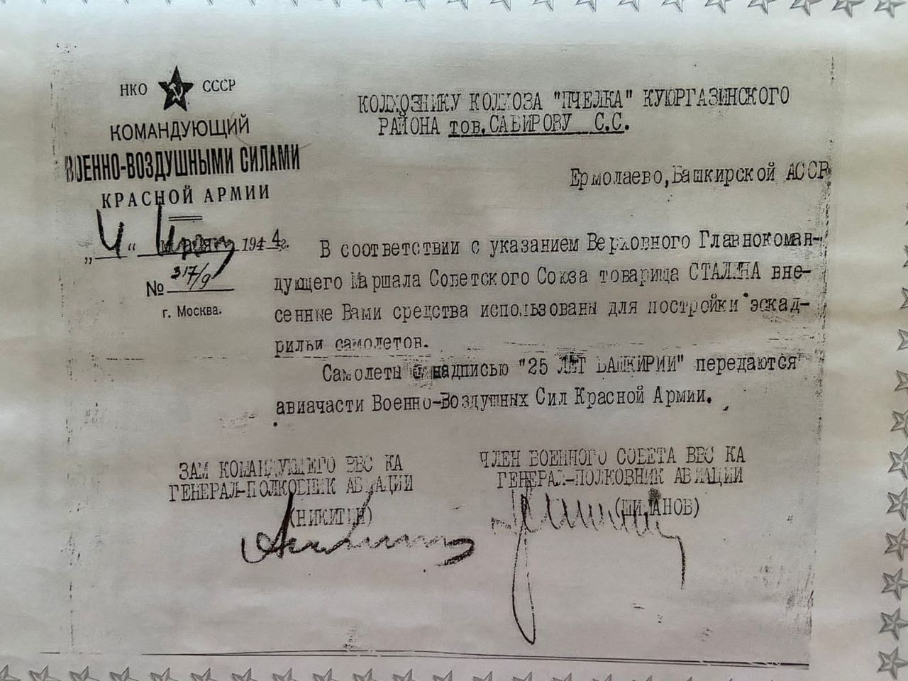 В феврале 1943 года состоялась сессия Ленинского сельсовета Кумертауского района, куда относится наша деревня Мамбеткулово. На сессии представитель райкома говорил о подвигах солдат на фронте, о том, что их победа зависит от тружеников тыла. После доклада слово взял конюх Мухаметсалих Сабиров, который смело решил все накопленные деньги отправить для покупки самолета-истребителя. Он верил, что этот самолет приблизит победу над врагом.