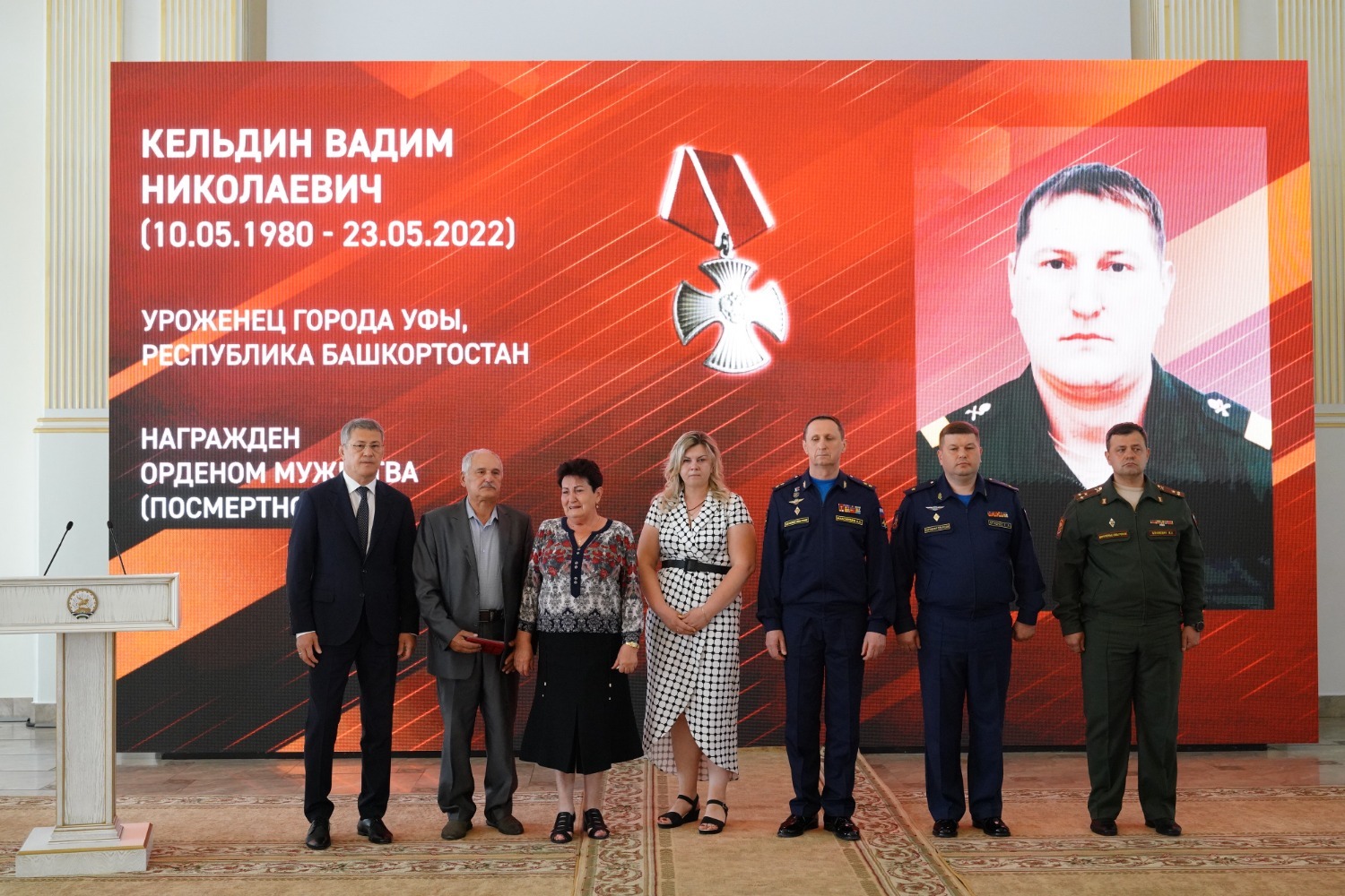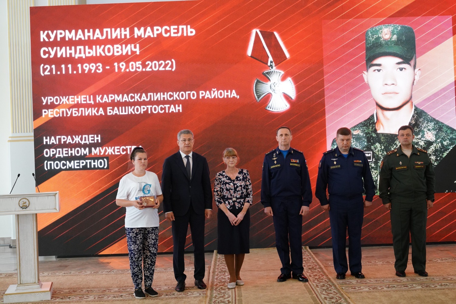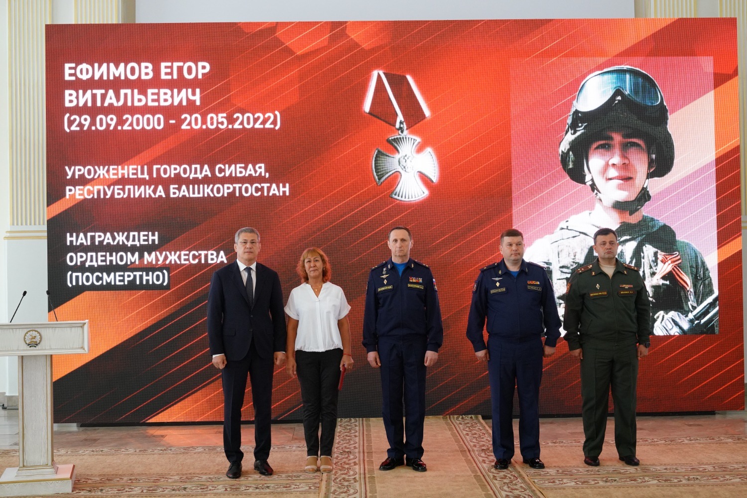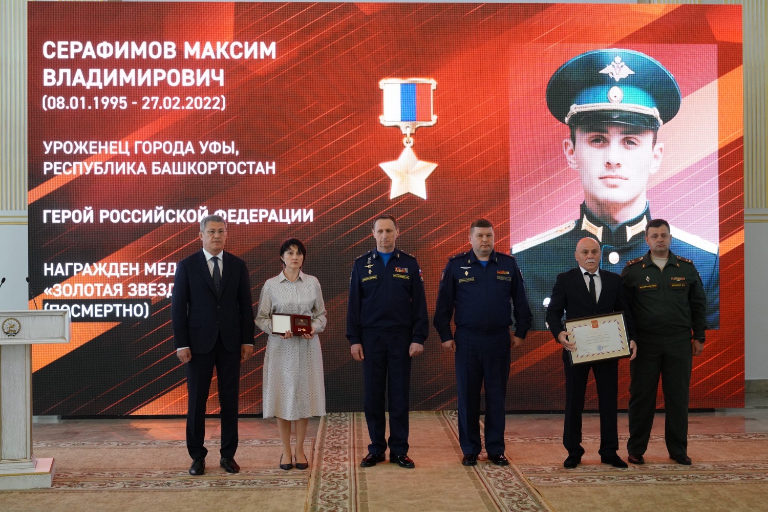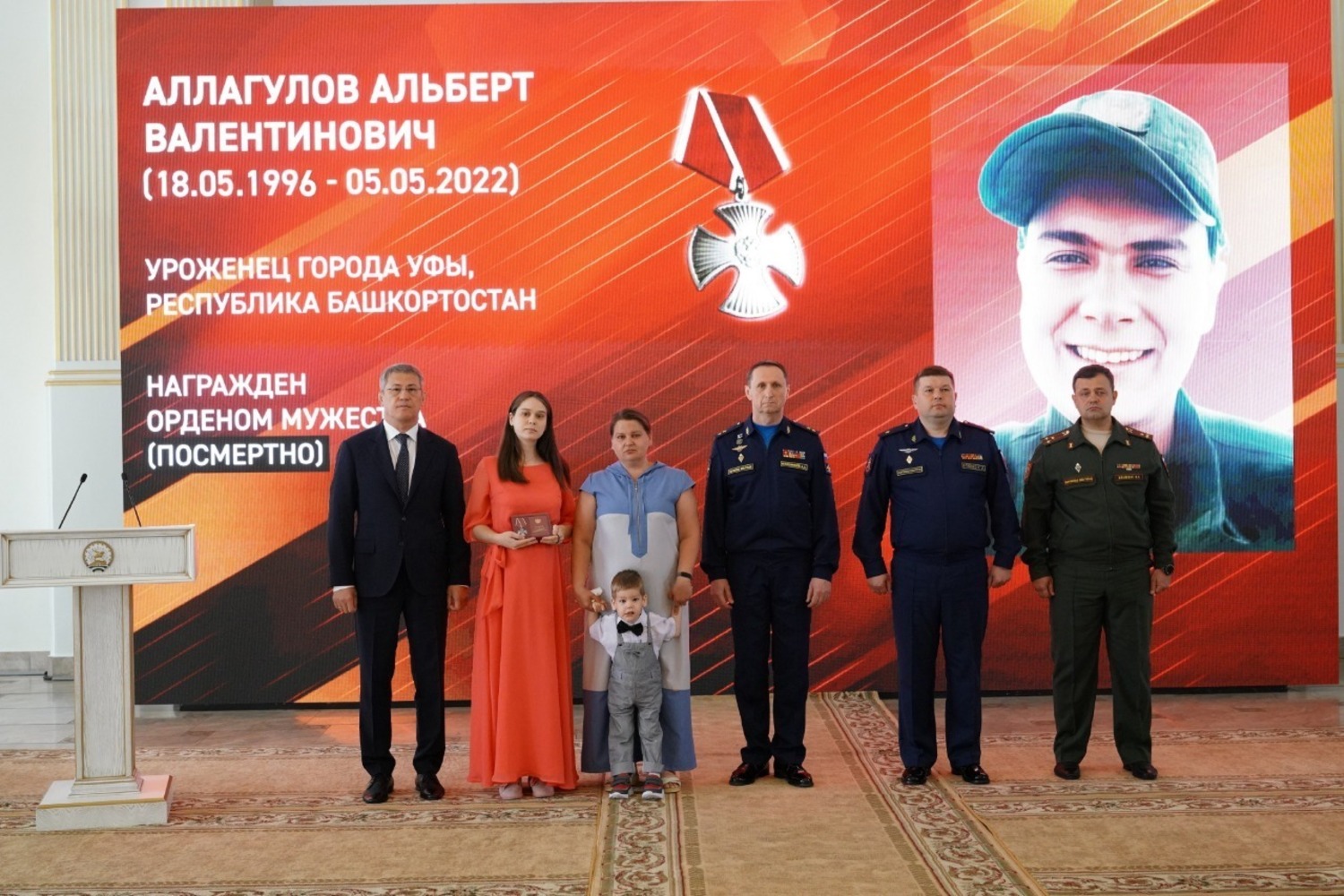 Медали «Золотая Звезда» родным военнослужащих вручили заместитель главнокомандующего Воздушно-космическими силами по военно-политической работе, генерал-лейтенант Александр Максимцев и Глава Башкирии Радий Хабиров. Орденом Мужества за героизм, мужество и отвагу Указом Президента России посмертно награждены рядовой Альберт Аллагулов из Уфы, ефрейтор Егор Ефимов из Сибая, старший сержант Вадим Кельдин из Уфы и сержант Марсель Курманалин из Кармаскалинского района.