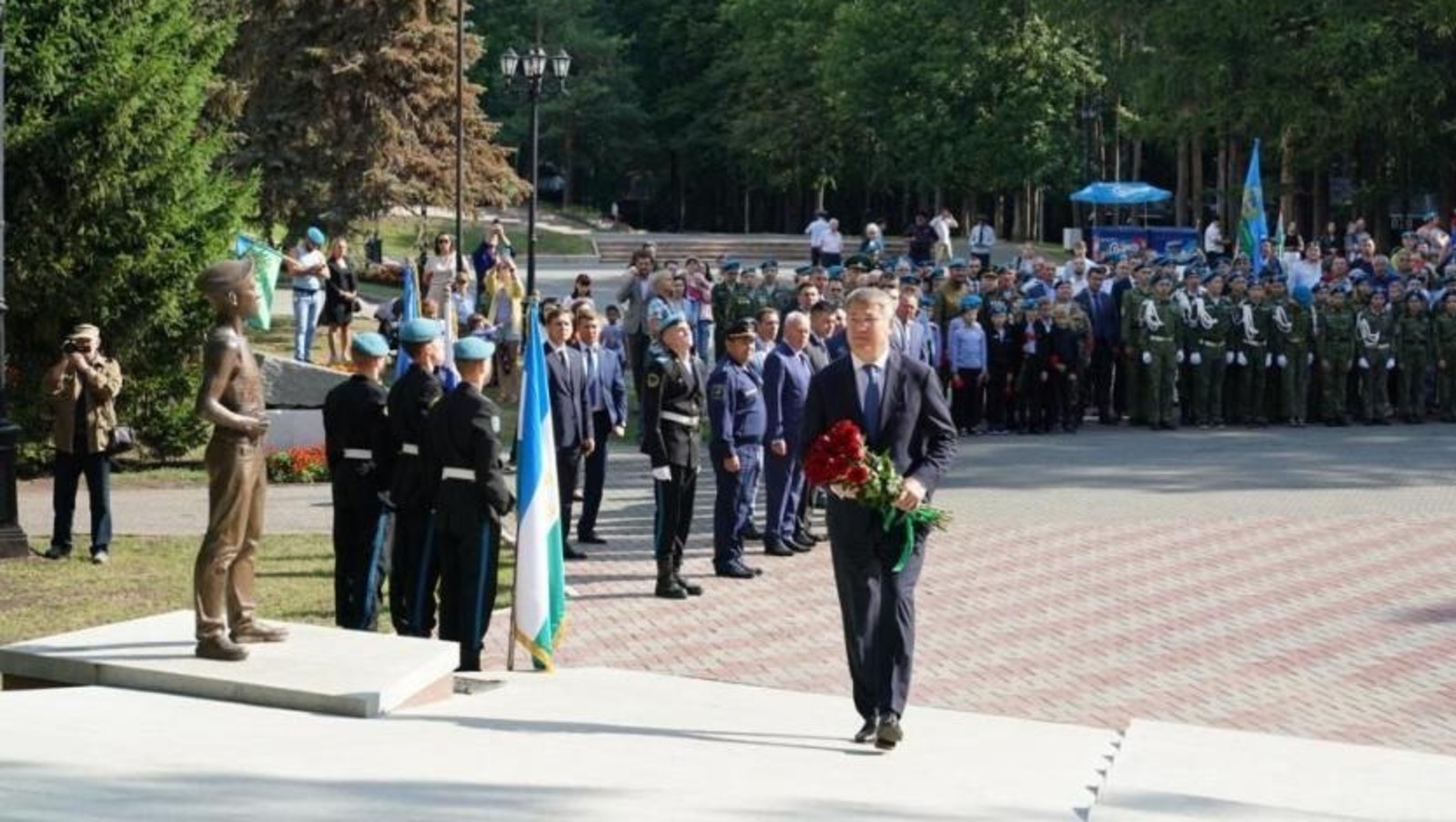 Сегодня в Уфе в честь 92-й годовщины образования воздушно-десантных войск России Глава Башкирии Радий Хабиров и мэр города Ратмир Мавлиев возложили цветы к памятнику «Союз поколений десантников» в парке Победы.
