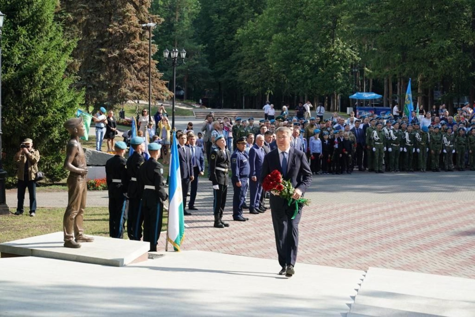 В праздничный день он вспомнил о бессмертном подвиге уроженцев Башкортостана, удостоенных высокого звания Героя России. Это командир 104-го гвардейского парашютно-десантного полка, гвардии полковник Сергей Тулин, отличившийся при освобождении Гудермеса от боевиков; заместитель командира парашютно-десантного батальона, гвардии майор Александр Доставалов, павший в бою с превосходящими силами боевиков в Чеченской Республике; гвардии сержант Артур Курбангалеев, который в бою с террористами в Дагестане закрыл собой раненых боевых товарищей от осколков вражеской мины.