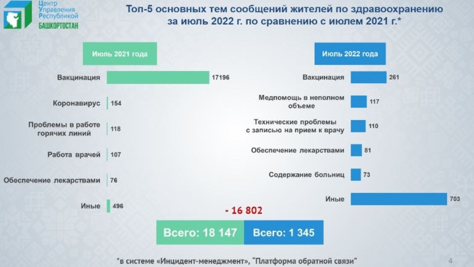 По ее словам, всего в июле этого года в системы ЦУР РБ от жителей республики поступило 1 345 обращений на тему здравоохранения, это почти на 17 тысяч сообщений меньше по сравнению с аналогичным периодом прошлого года. Тогда ажиотаж был вызван указом Главы республики от 17 июня и ужесточением требований по вакцинации.