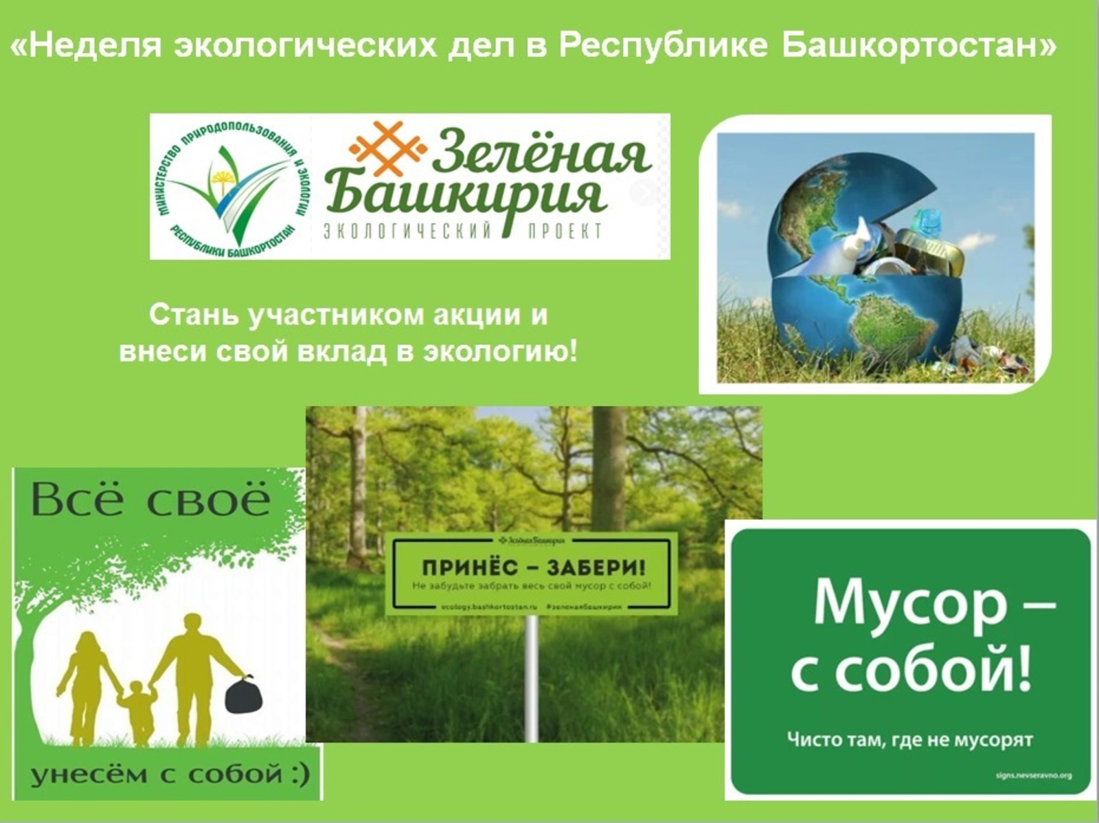 Как отметил министр природопользования и экологии республики Нияз Фазылов, именно летом берега рек и озер, лесные опушки оказываются завалены остатками жизнедеятельности человека — бумагой, целлофановыми пакетами, консервными банками и бутылками. На их разложение уходит огромное количество времени. Возникают «стихийные» свалки отходов, которые наносят огромный урон окружающей среде, повреждая и загрязняя почву, водоемы, а также повышают риск возникновения пожара. Поэтому от действий каждого отдыхающего зависит не только вид любимого места для отдыха, но и целая экосистема определенной территории.