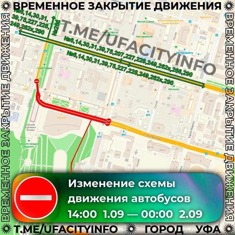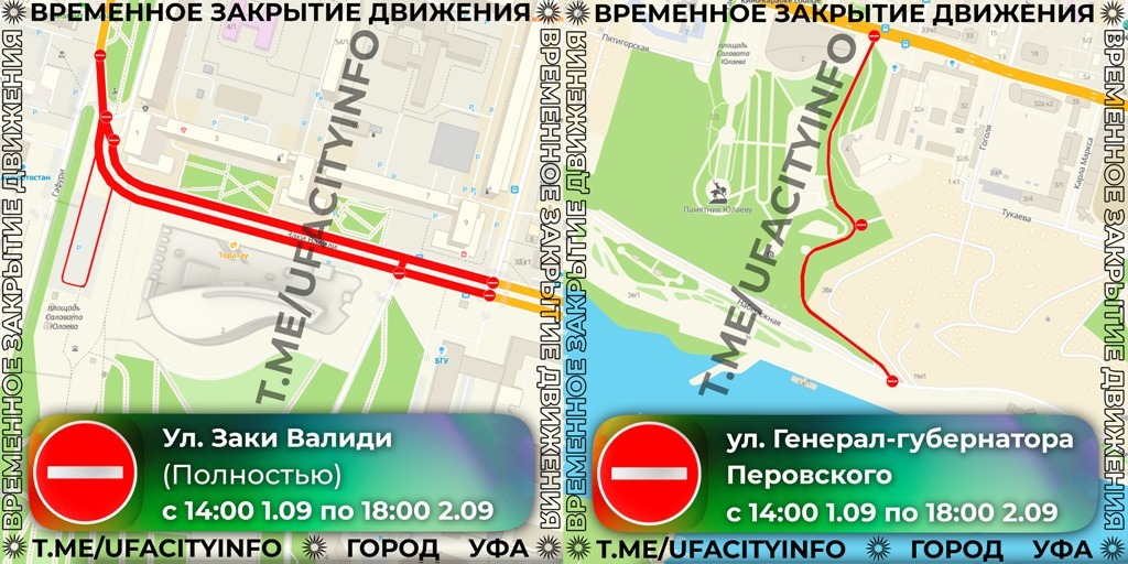 С 14 часов 1 сентября до 00.00 часов 2 сентября перекроют улицы Генерала-губернатора Перовского и Заки Валиди - на участке от ул. Гафури до ул. Аксакова.