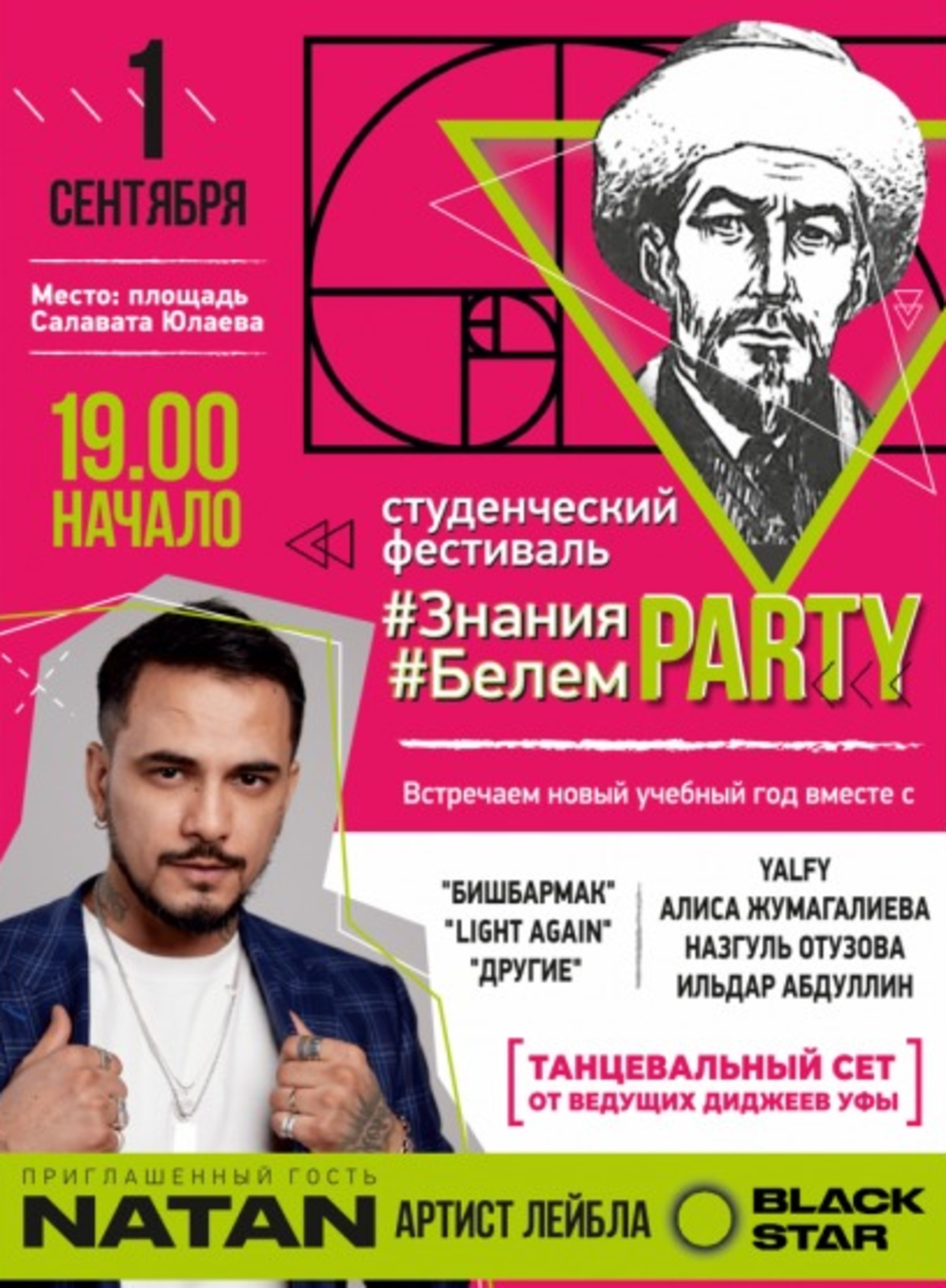 Гостей фестиваля #ЗнанияPARTY ждет большая дискотека от ведущих диджеев Уфы, праздничный концерт с YALFY, Алисой Жумагалиевой, Назгуль Отузовой, Ильдаром Абдуллиным, группами «Бишбармак», «Light Again», «Другие». Хедлайнером мероприятия станет артист лейбла Black Star – Natan.