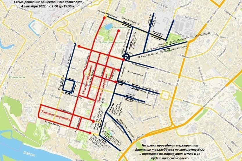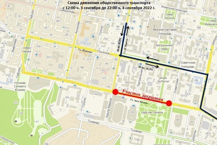 — с 12.00 3 сентября до 22.00 4 сентября — ул. Заки Валиди, от ул. Карла Маркса до ул. Советской;