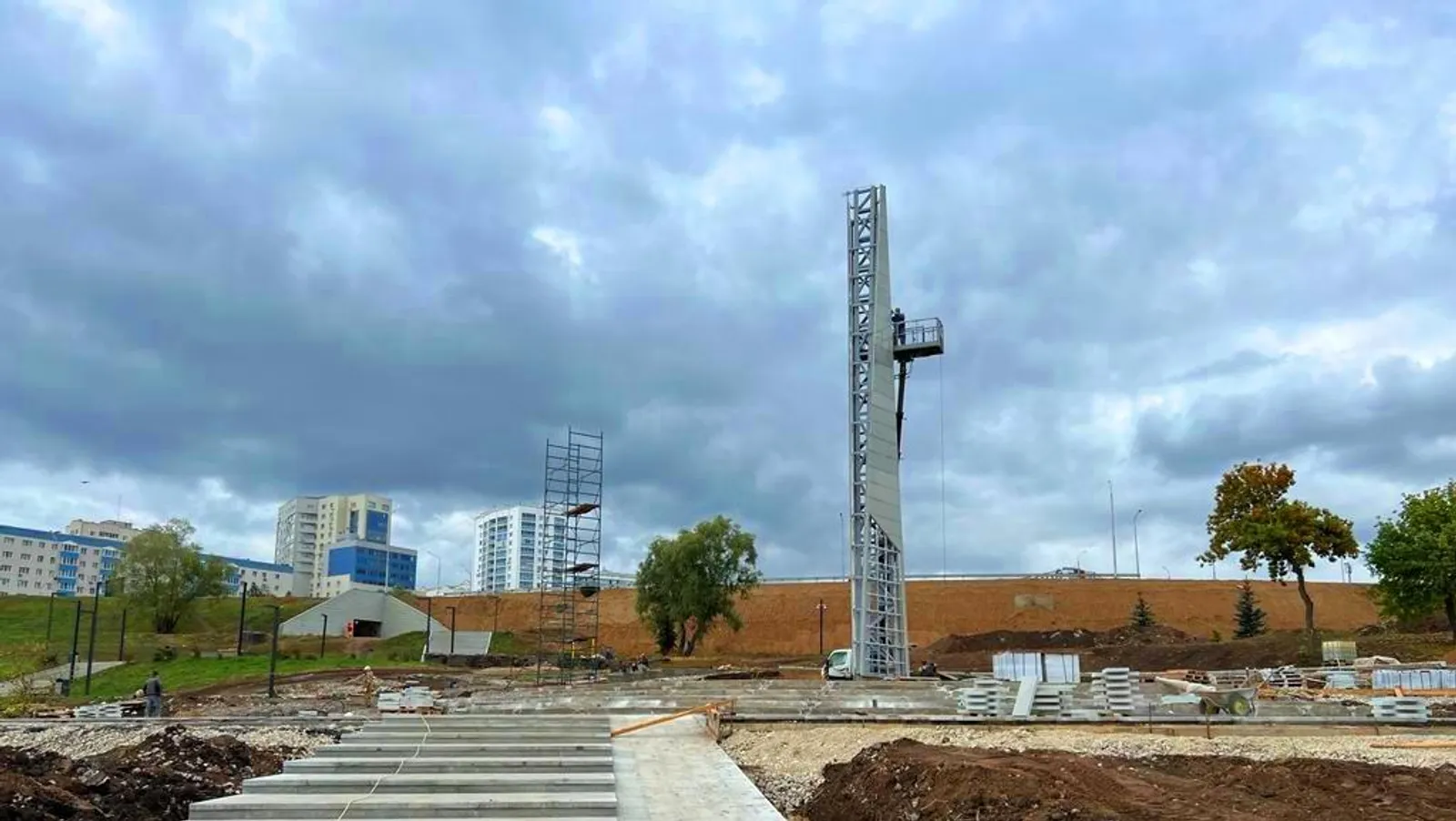 По состоянию на 26 сентября в стадии завершения находятся арматурные и бетонные работы. В настоящее время на объекте строители заняты облицовкой стелы и устройством пешеходных дорожек. На сегодняшний день уже изготовили бронзовый рельеф стелы, заказаны и находятся в процессе изготовления гранитные плиты и бронзовый рельеф пилона. Стела ночью будет подсвечиваться. Для этого установят специальные прожекторы.