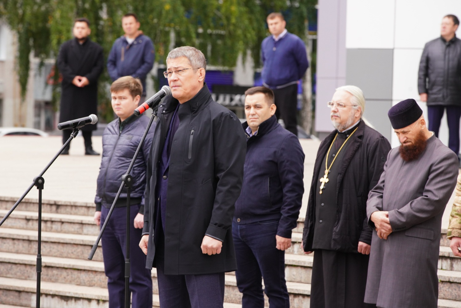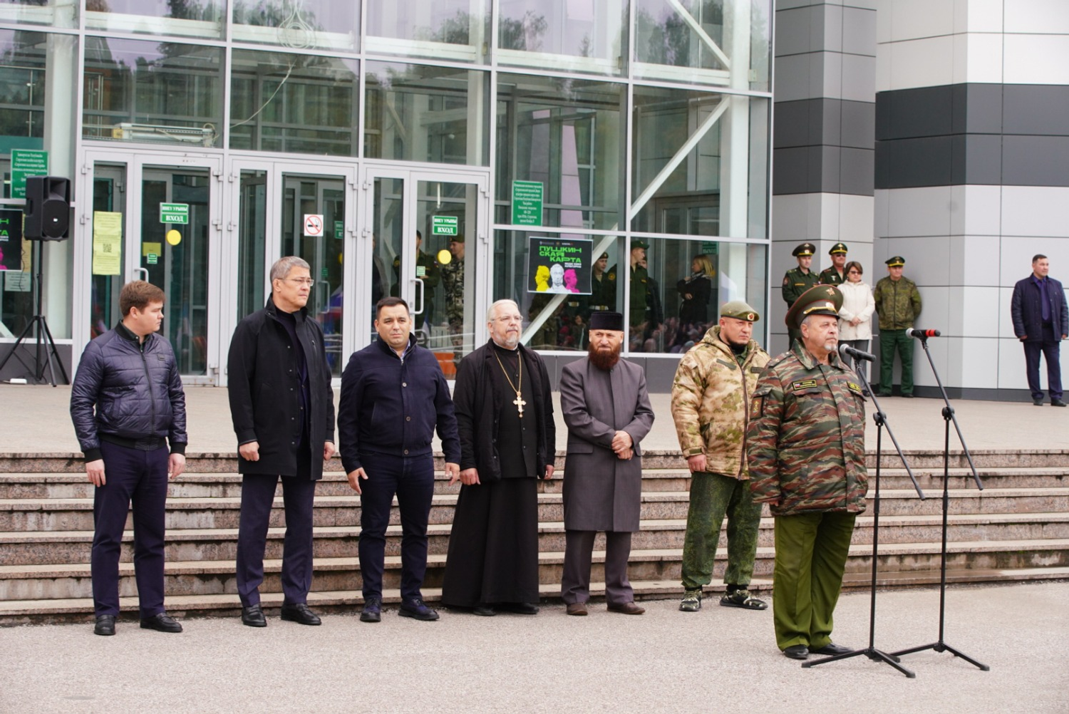 «Хөрмәтле яҡташтар! Уважаемые земляки! Мы сегодня собрались здесь, а в душе у нас два слова – уважение и благодарность. Уважение вам, настоящим мужчинам. Непростое время, но непростое время и порождает настоящих мужчин. Благодарность - за то, что вы идёте нас защищать, защищать нашу страну, защищать измученных людей Донбасса, которые в эти дни принимают решение войти в состав нашей большой страны. И ещё я хочу сказать, что тысячи наших парней из Башкортостана – военнослужащих министерства обороны, Росгвардии, двух батальонов имени Минигали Шаймуратова и Александра Доставалова, добровольческих отрядов "Барс "и других, воюют уже несколько месяцев там. Я с ними постоянно общаюсь, им нужна помощь, и они вас правда очень ждут. Мы сегодня с надеждой смотрим на вас, что вы выполните свой воинский долг, поддерживая друг друга, защищая друг друга. Мы смотрим с надеждой, что вы все живыми и невредимыми вернётесь домой, точно так же, плечом к плечу, как сегодня. Мы вас будем ждать. Я вам сегодня перед отправкой на специальную военную операцию, как Глава республики, хочу сказать – я сделаю всё, чтобы все усилия нашей республики были направлены на то, чтобы помочь вам, чем можем. Мы будем приезжать к вам, поддерживать вас, во всём будем помогать. Ещё хочу сказать, что все усилия республики будут направлены на то, чтобы вы не переживали за ваших родных и близких, мы им будем помогать, твёрдо вам обещаю. Работайте, братья», - сказал Радий Хабиров на митинге.