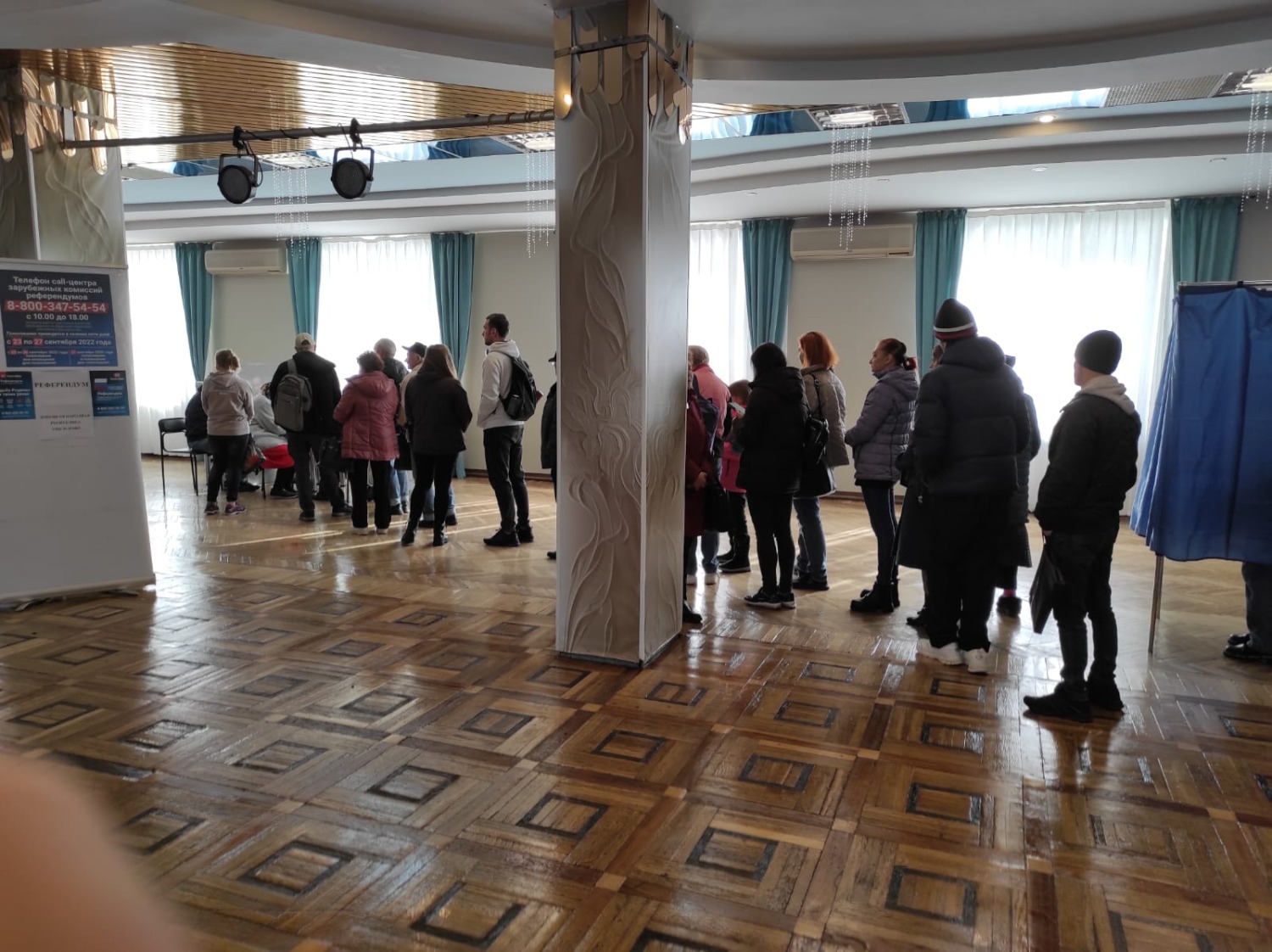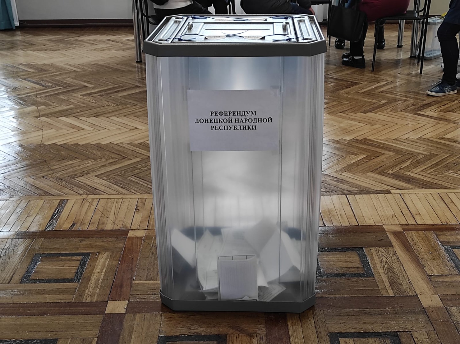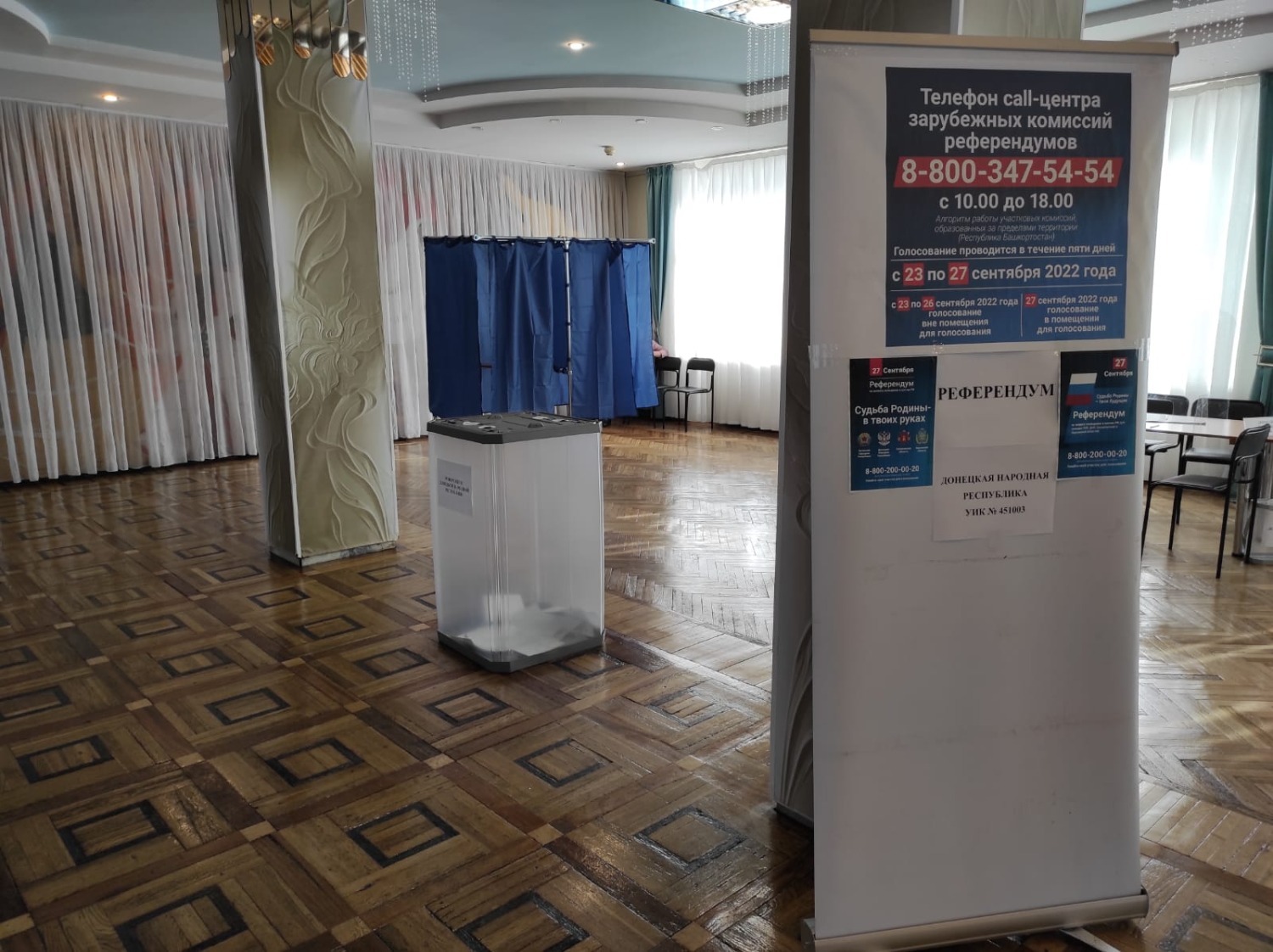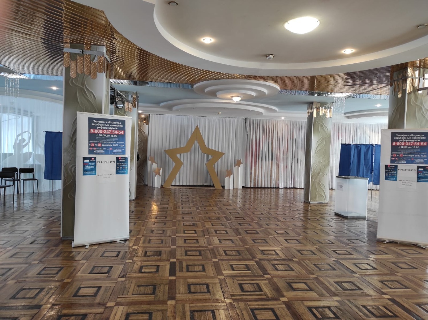 На втором этаже дворца культуры расположились 4 избирательных участка, на которых работают соответственно представители ДНР, ЛНР, Запорожской и Херсонской областей. Для каждого региона выделена специальная зона, в которой помимо членов избиркомов находятся закрытые кабинки для голосования и урны для бюллетеней.