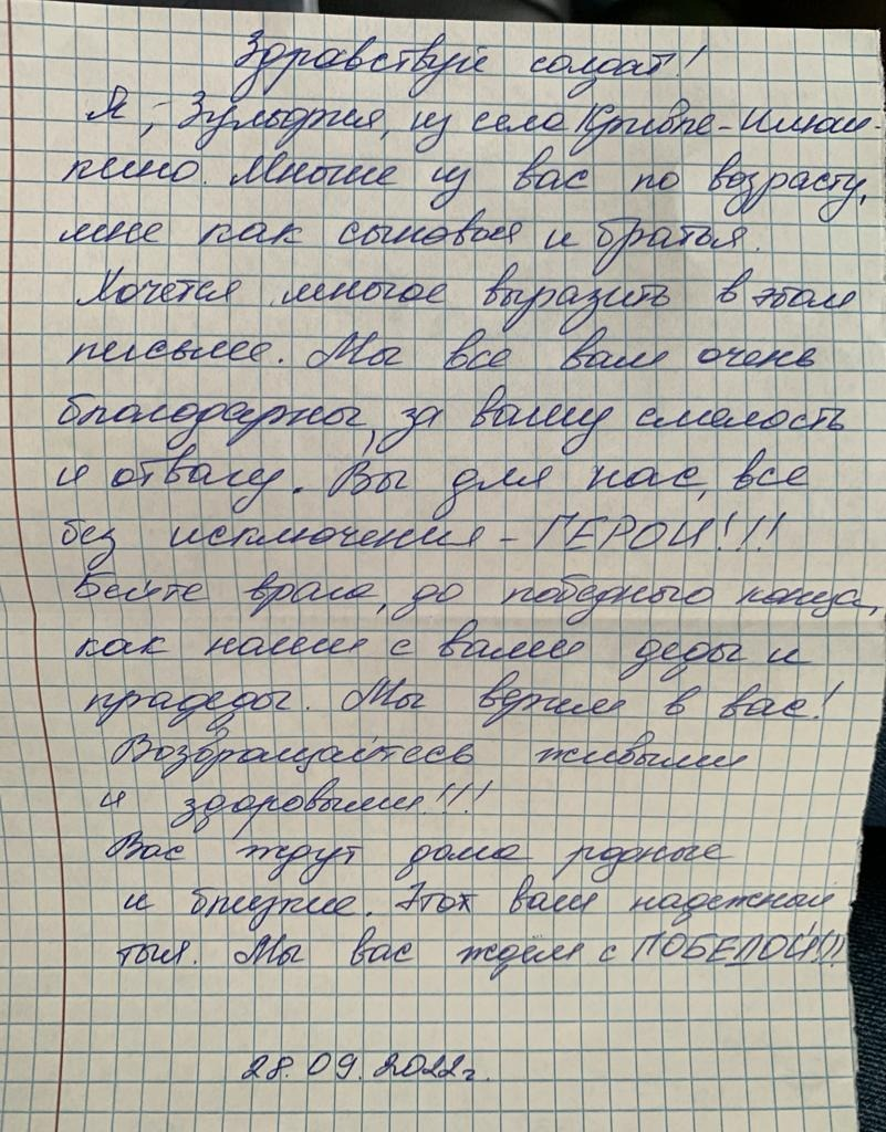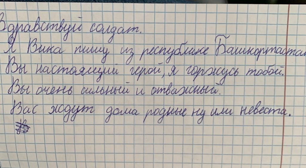 По его словам, буквально за несколько дней жители района и города собрали почти 200 тысяч рублей, на которые были закуплены коврики-пенки, спальники, фонари, батарейки и прочие вещи, которые могут пригодиться ребятам во время службы. Конечно, по линии министерства обороны бойцы получат полный комплект обмундирования и техоснащения, но запас лишним не бывает. Как уже писал «Башинформ», бывалые бойцы советуют сверх необходимого лимита иметь под рукой дополнительный комплект одежды, лекарства, средства гигиены и прочие вещи. А еще, пожалуй, самое ценное - письма и рисунки школьников с пожеланиями вернуться домой с Победой, со словами гордости за воинов.