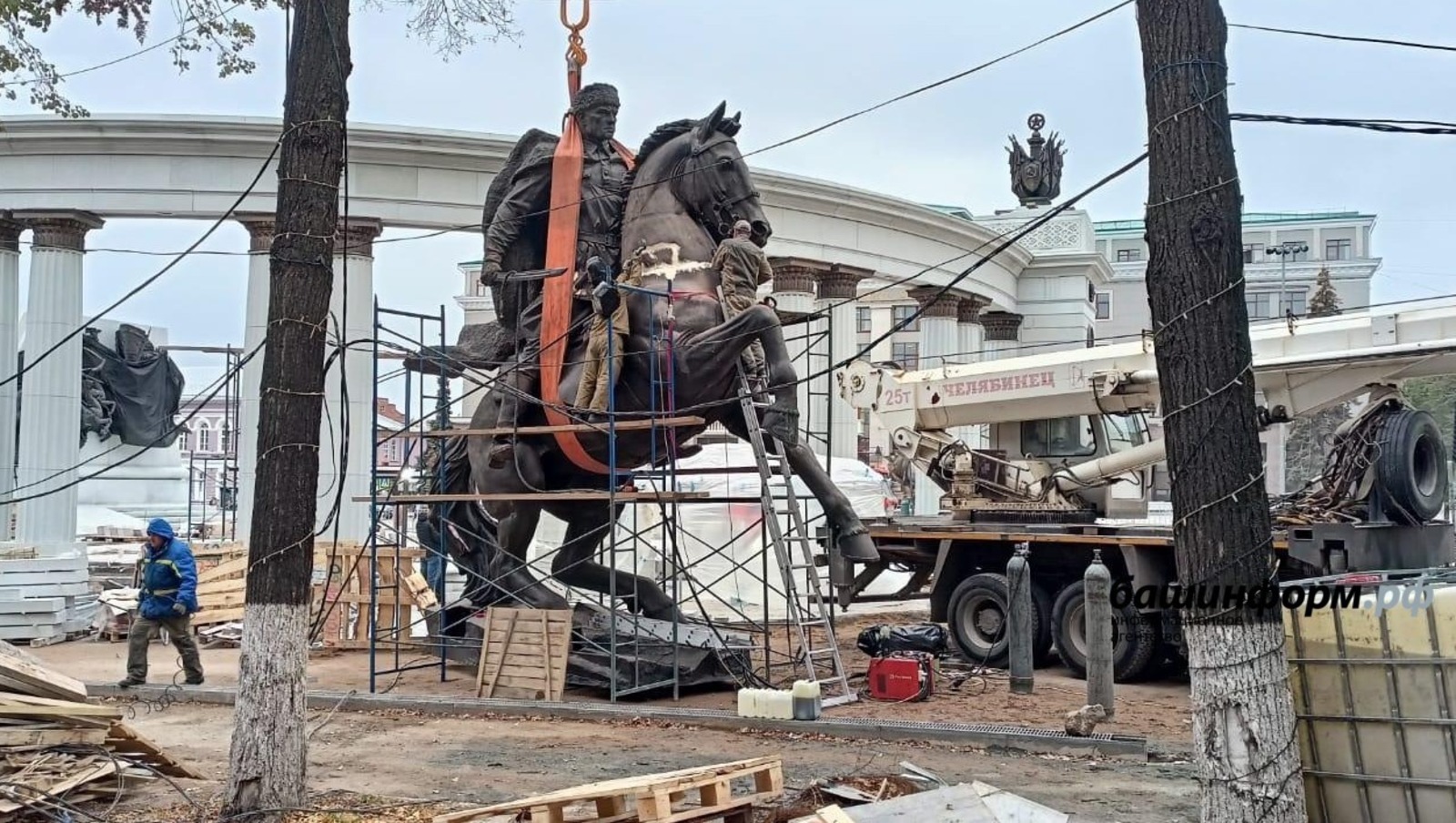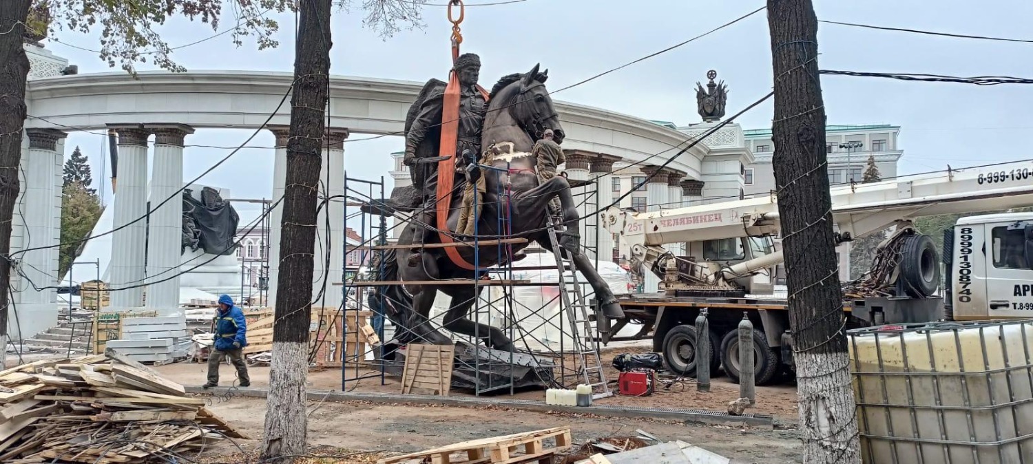 Памятник легендарному командиру 112-й Башкирской кавалерийской дивизии, Герою России Минигали Шаймуратову пока находится рядом с постаментом и совсем скоро будет водружен на него.