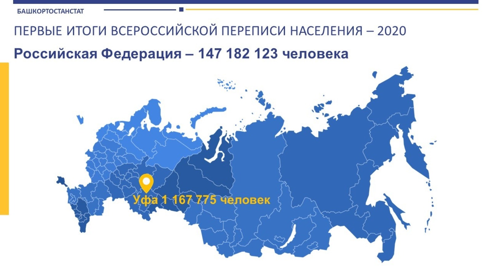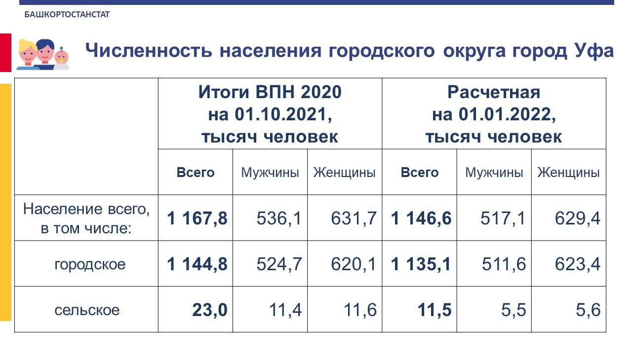 По данным переписи на 1 октября 2021 года, в Уфе проживает 1 миллион 167 тысяч 775 человек, из которого 1 млн 144 тысячи 809 человек – городского населения и 22 966 – сельского. Доля мужчин и женщин в процентном соотношении составила 49,6 и 50,4 процента соответственно. Основной рост численности пришелся как раз на сельское население городского округа.
