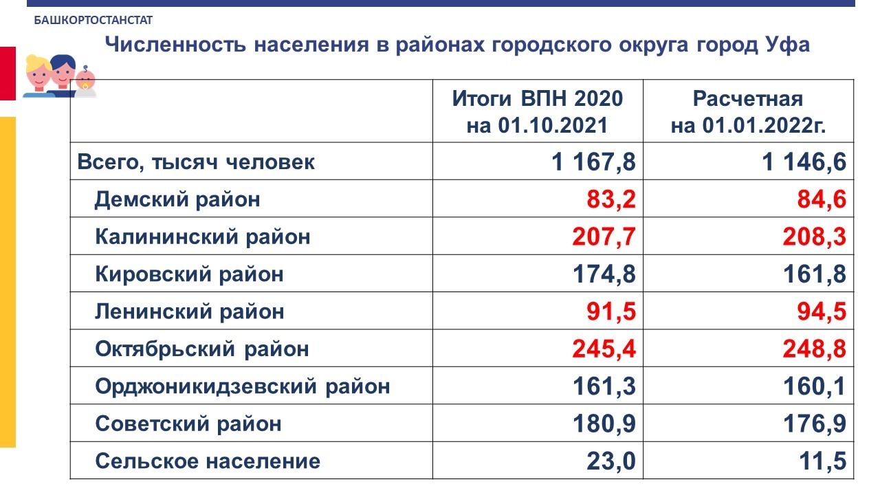 В сравнении с расчетной численностью на 1 января этого года, в Демском, Ленинском, Октябрьском и Калининском районах наблюдается снижение количества жителей. А вот в Кировском районе идет значительный прирост: 174 837 человек против 161 807 расчетной на 1 января 2022 года. Увеличение городской части населения зафиксировано также в Орджоникидзевском и Советском районах.