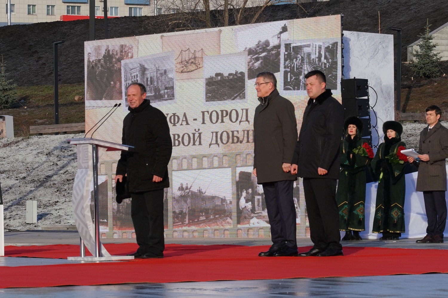 «Четыре долгих года Великой Отечественной войны труженики вели свой бой. Без права на отступление, отгул или выходной. В историю навсегда вписан самоотверженный подвиг рабочих уфимских предприятий, моторостроительного производственного объединения, хлопчатобумажного комбината и других предприятий, тружеников сельского хозяйства БАССР. Сегодня наш долг не только хранить память о событиях тех лет, но и защищать историческую правду о подвиге предков ради будущего нашей великой Родины — России. Поздравляю вас с открытием стелы и желаю всего самого доброго!» — отметил он.