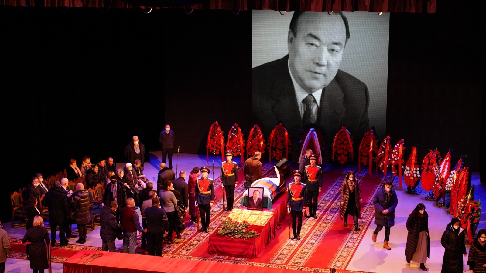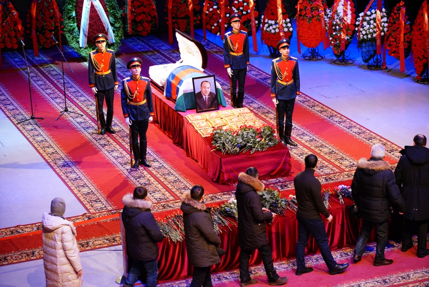 На сцене ГКЗ «Башкортостан» возле гроба первого президента Башкирии выставлен почетный караул. Пришедшие возлагают к телу покойного цветы и траурные венки. Количество желающих проститься с Муртазой Рахимовым растет с каждой минутой.