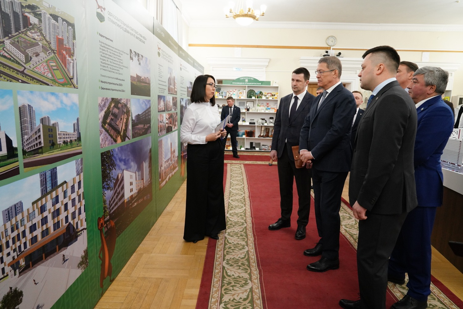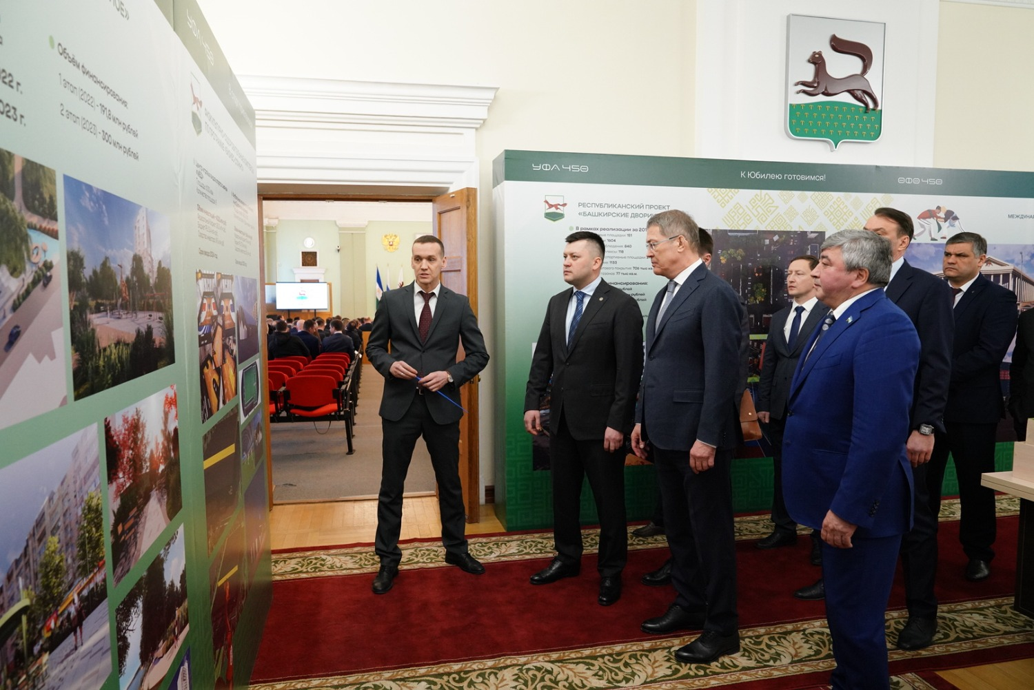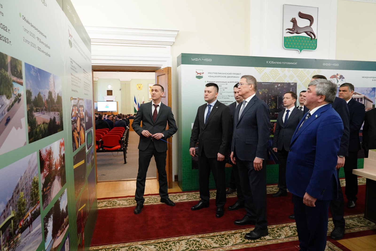 До начала рабочего совещания, посвященного подготовке к 450-летию Уфы, Радий Хабиров осмотрел выставку проектов, которые будут реализованы в столице к ее юбилею.