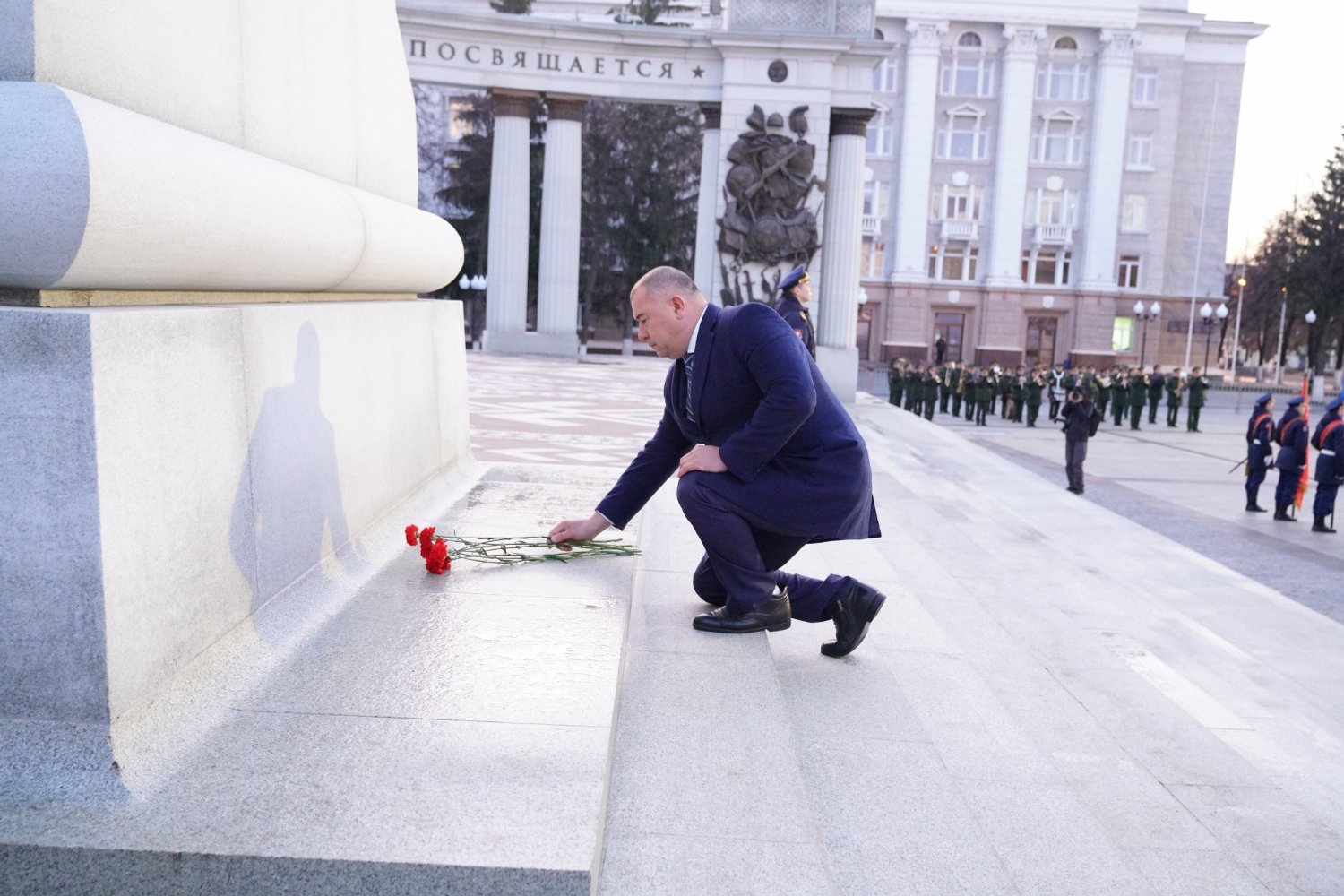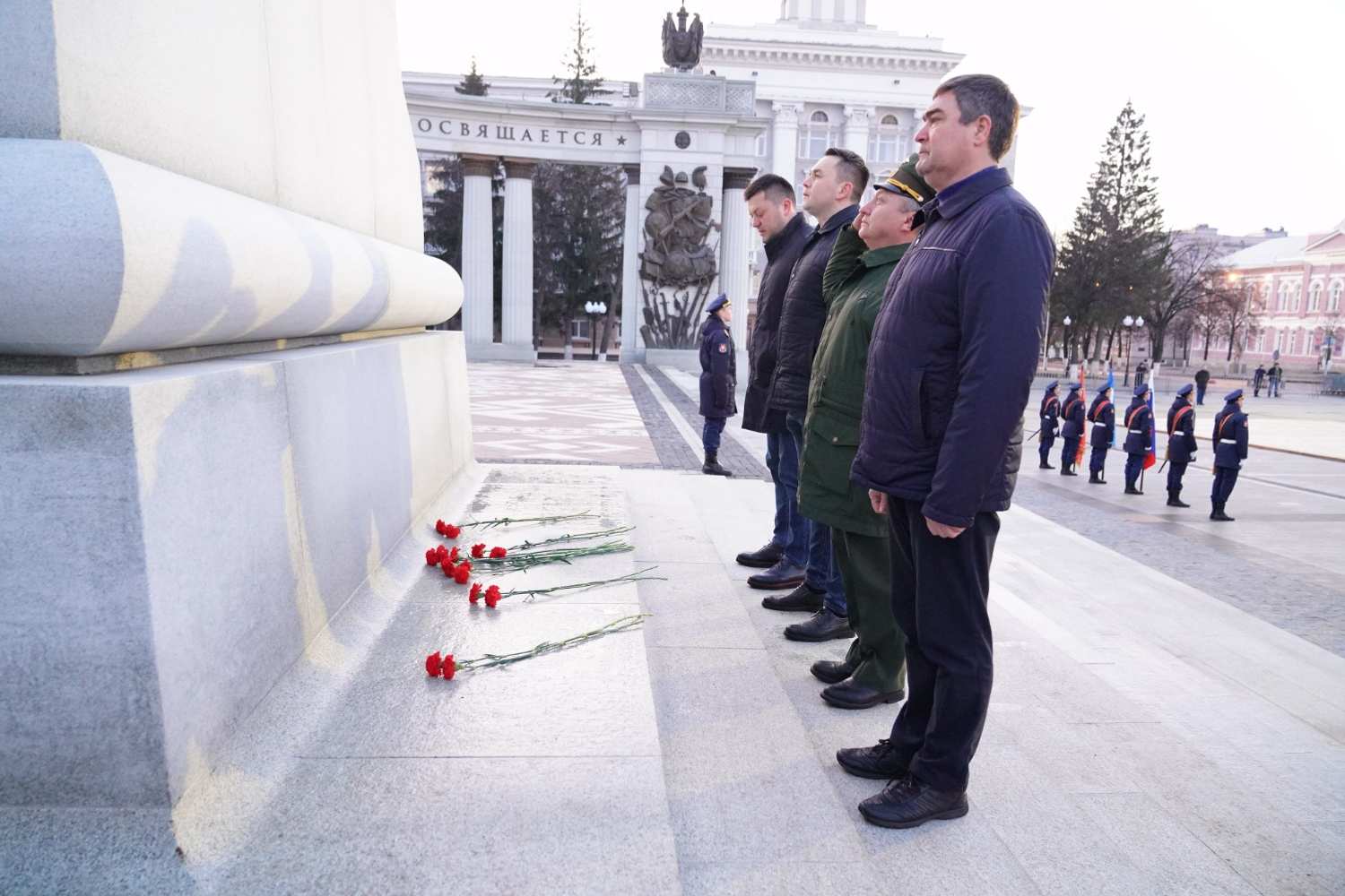 По сложившейся традиции бойцы и участники церемонии возлагают цветы к памятнику герою Великой Отечественной войны генералу Шаймуратову.