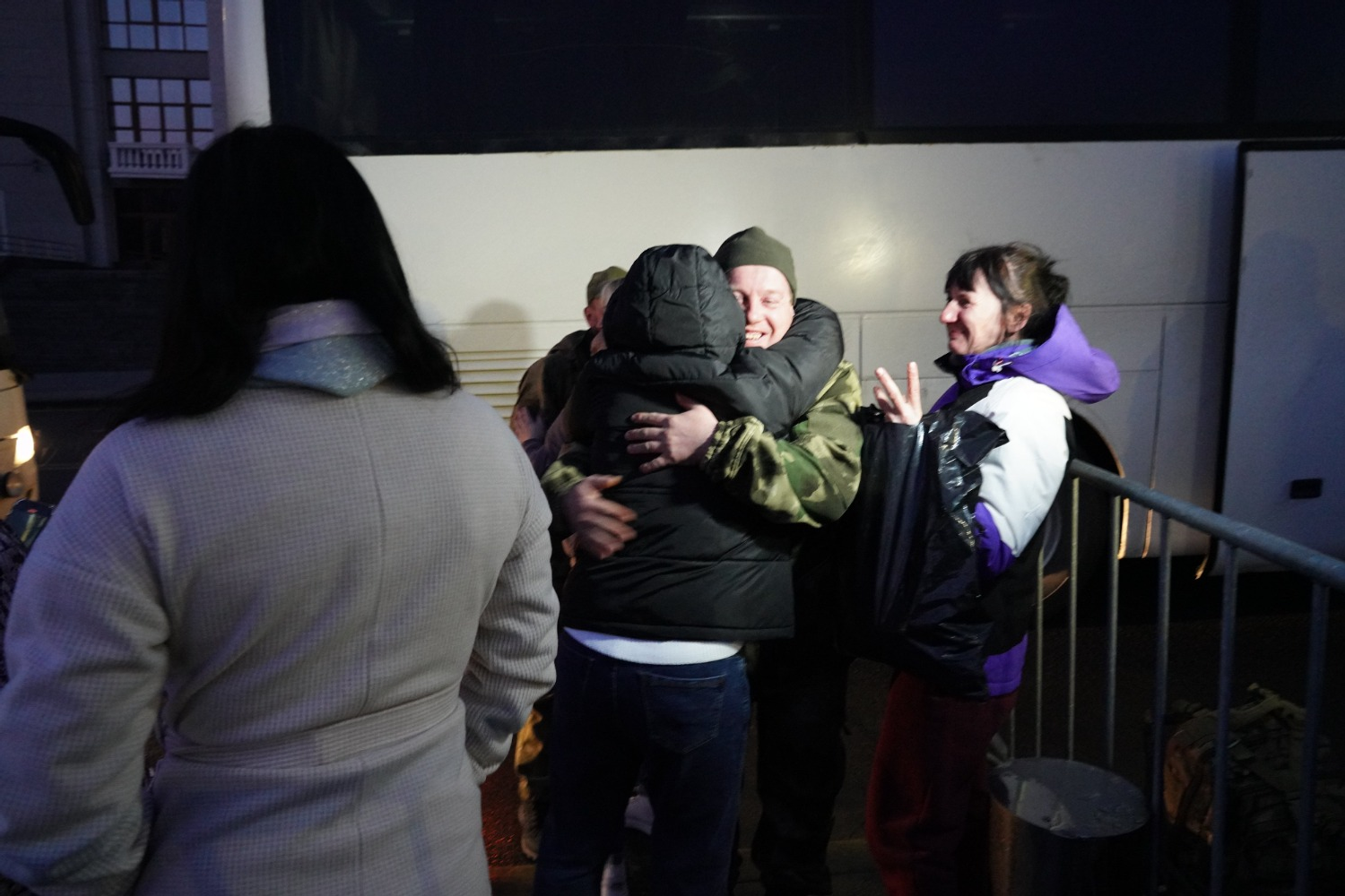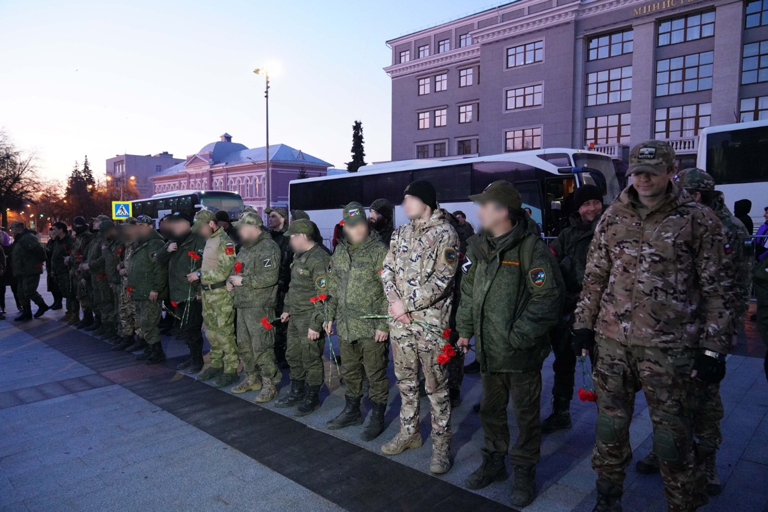 Далее бойцам предстоит добираться до дома, их уже ждут отправленные муниципалитетами автобусы и машины. Мелькают таблички — Белорецкий, Бурзянский, Зилаирский, Хайбуллинский, Иглинский, Архангельский районы.