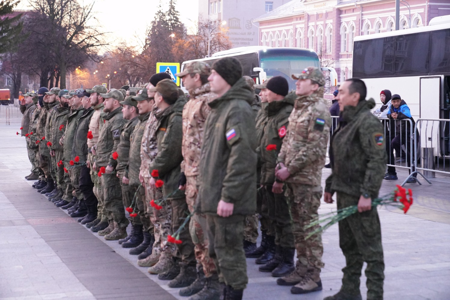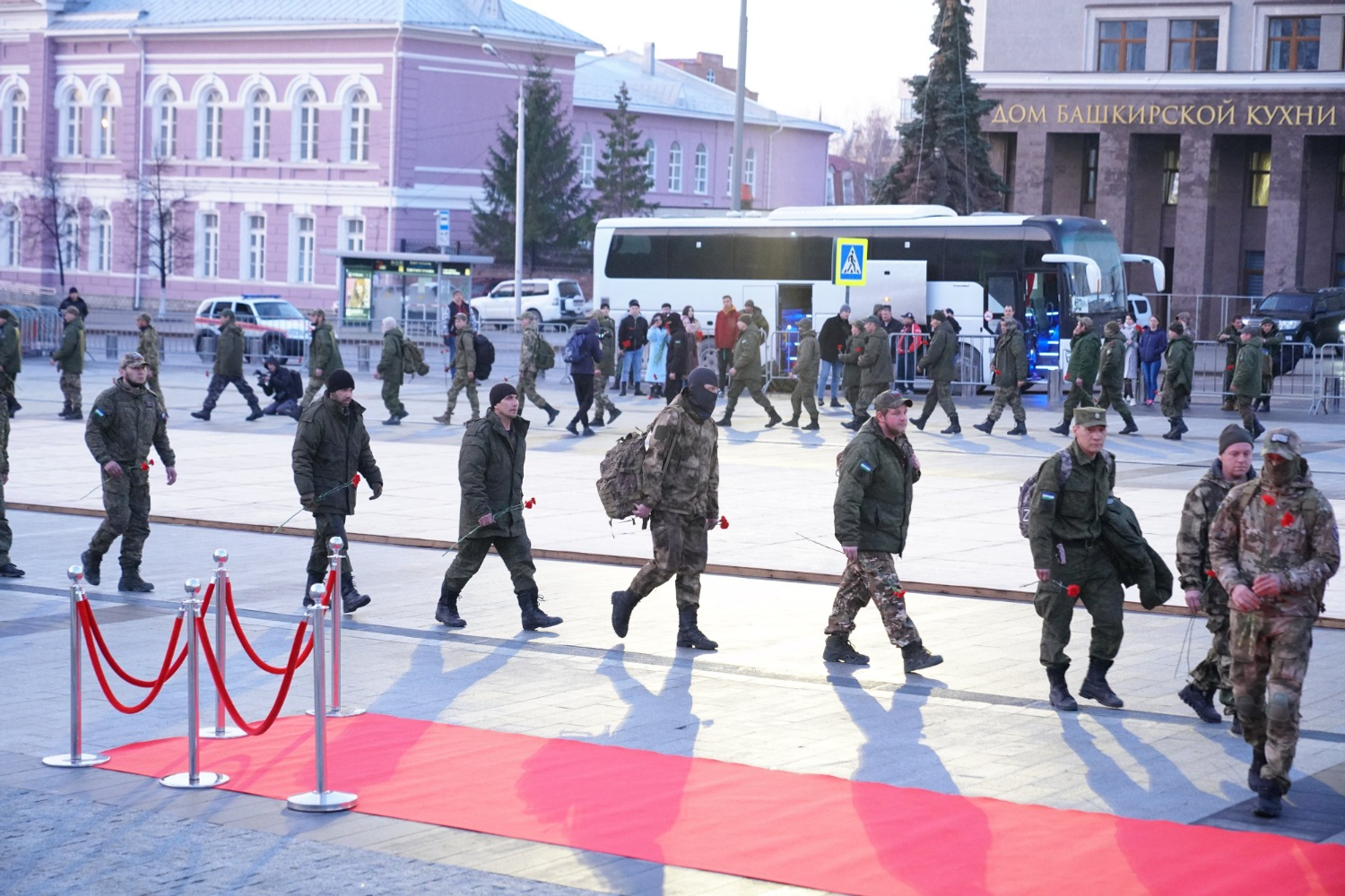 В Уфе сегодня, 2 апреля, встретили мобилизованных, приехавших в краткосрочный отпуск. Привезли их автобусы, отправленные из республики. Несмотря на ранний час, церемониал на Советской площади был соблюден полностью — с внесением знамени и возложением цветов. Прибывших встречали представители властей, военных братств и районов, оркестр, множество СМИ.