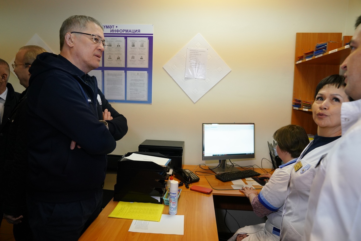 Глава республики посетил местный ФАП, который размещен в культурно-образовательном центре. Во время общения с заведующей фельдшерско-акушерским пунктом Ириной Канайкиной Радий Хабиров поинтересовался, как идет запись пациентов к врачам узких специальностей, есть ли возможность выписки рецептов и больничных листов.