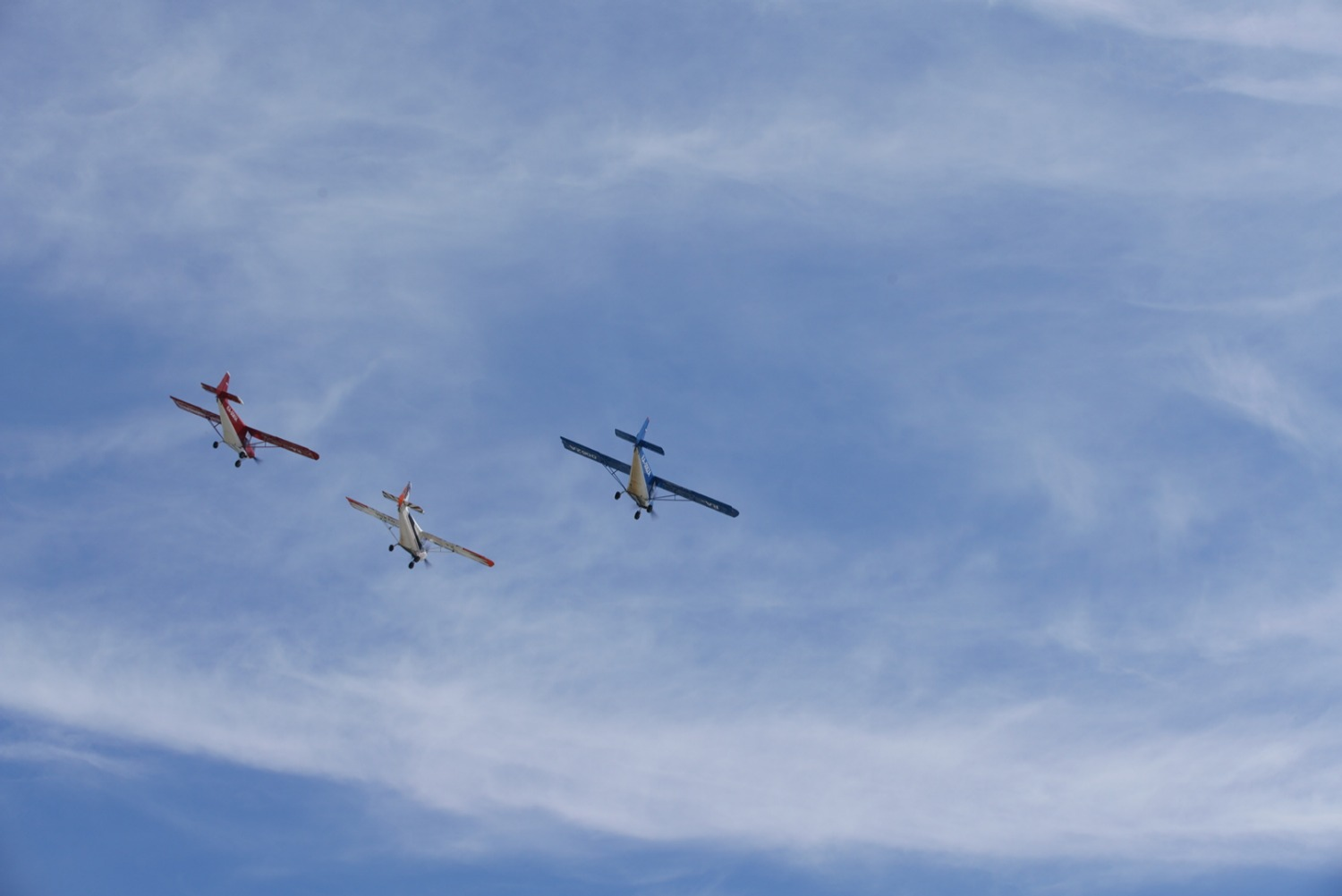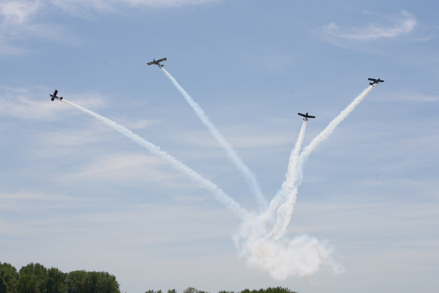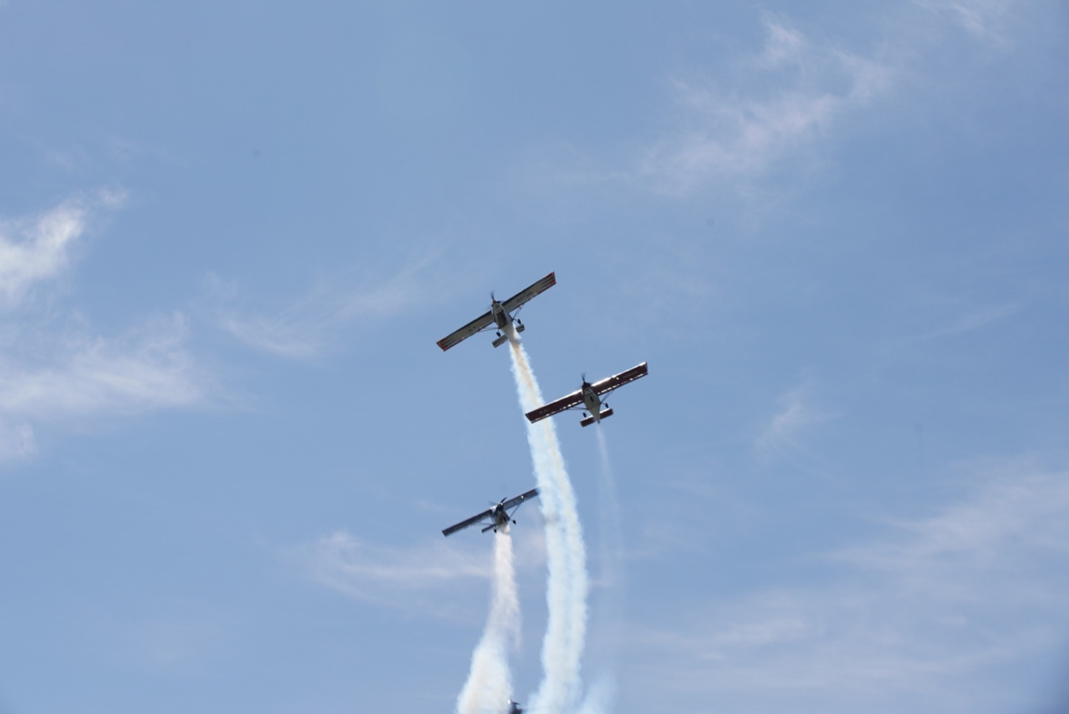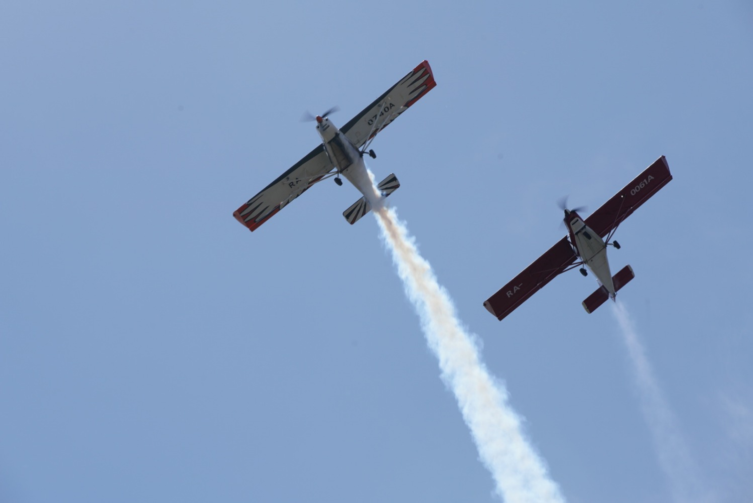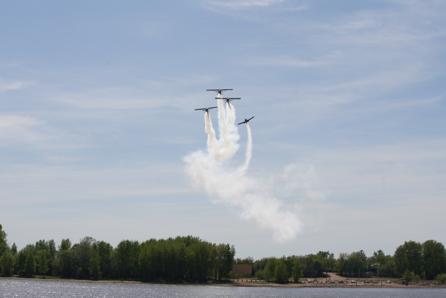 В продолжение праздничной программы в небе над рекой Белой состоялись показательные выступления авиационной группы аэродрома «Первушино». Летчики продемонстрировали авиашоу с эффектной дымовой завесой.