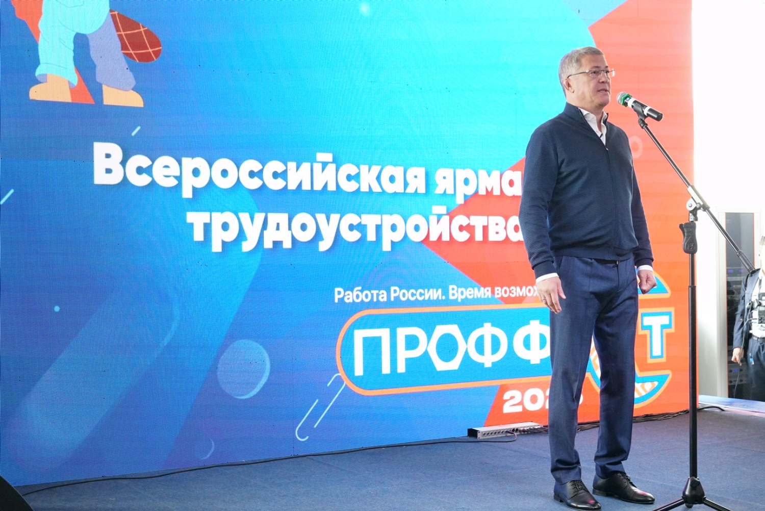 «Приветствую вас на Всероссийской ярмарке трудоустройства. Здесь собралась молодёжь. Мы ждём, что сегодня придёт много ребят посмотреть. Потому что нашей замечательной молодёжи, которая завершает учёбу, предстоит сделать один из самых главных выборов в своей жизни. Их вообще два: найти своего спутника или спутницу жизни, а второе – найти хорошую работу. Вот чтобы найти хорошую работу мы и делаем такое мероприятие.