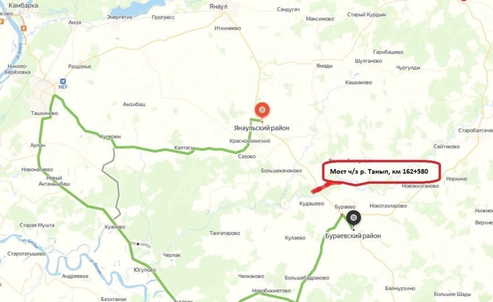 Пока же водители могут воспользоваться объездными путями по дорогам Дюртюли — Бураево, Дюртюли — Нефтекамск, Красный Холм — Нефтекамск и Кузбаево — Янаул.