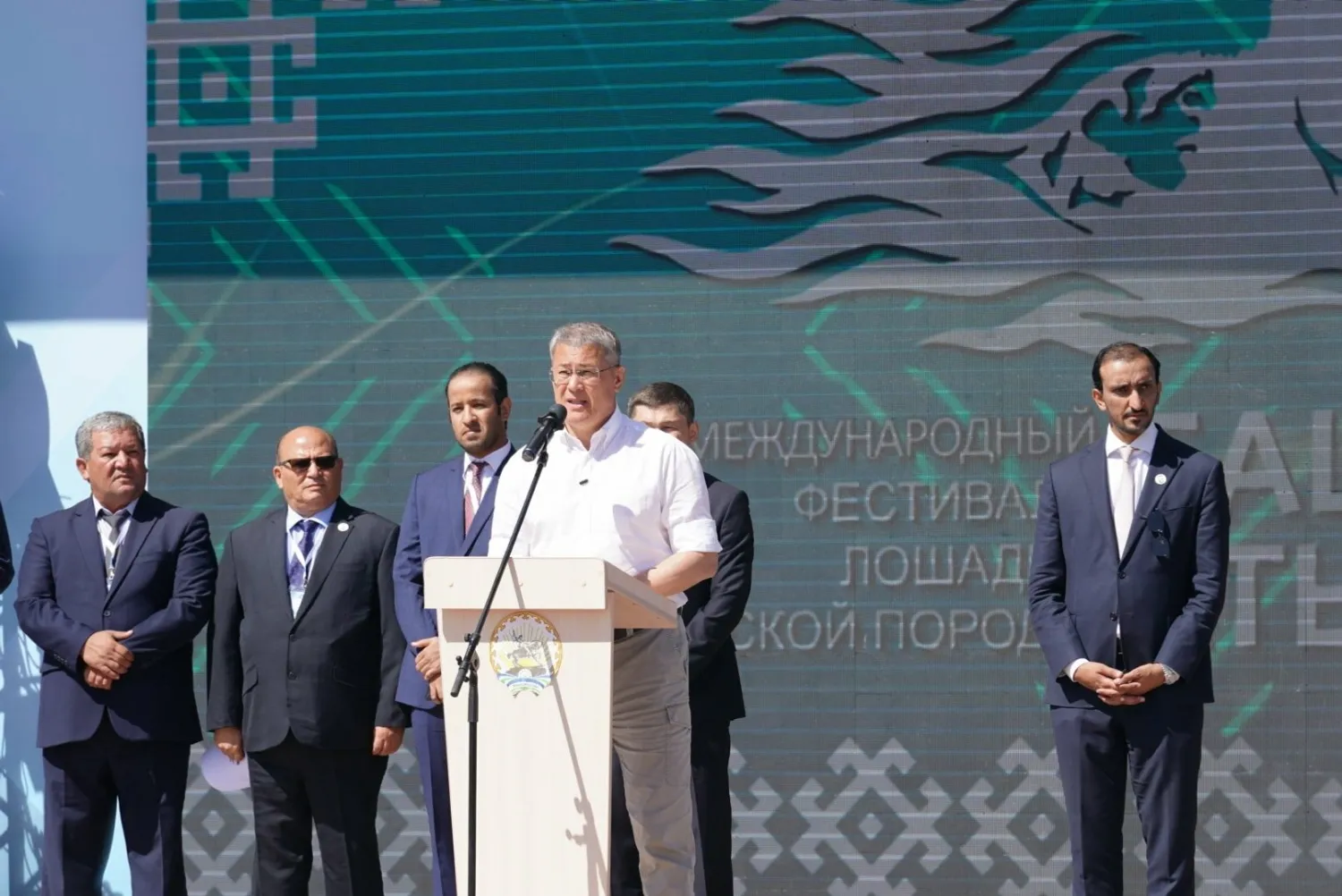 «Хәйерле көн, хөрмәтле яҡташтар! Хәйерле көн, хөрмәтле ҡунаҡтар! Хәйерле көн, ҡәҙерле баймаҡтар! Добрый день, дорогие друзья, дорогие гости! От души приветствую участников уже второго и уже международного фестиваля «Башҡорт аты». Сегодня с особым удовольствием и благодарностью обращаюсь к нашим гостям. К нам приехали представители семи государств: Казахстана, Узбекистана, Беларуси, Кыргызстана, Турции, Объединенных Арабских Эмиратов, Азербайджана. Давайте их поблагодарим, что они сегодня с нами. Мы приветствуем наших гостей из регионов нашей страны. Здесь на самом деле собрались все большие специалисты в области коневодства. Но самое главное, собрались все те, кто любит это священное животное – лошадь. Для башкир конь имеет огромное значение. Это, по сути, часть генетического кода нашего народа. Лошадь – это и верный соратник, спутник, помощник. Мы все знаем, что благодаря лошади наши «Северные амуры» и «шаймуратовцы» вошли в Париж, Берлин. И сегодня они тоже рядом с нами. Сегодня большое событие в истории нашей республики. Наконец, мы получили юридическую защиту породы «башкирская лошадь». Федеральная служба по интеллектуальной собственности внесла в реестр понятие «башкирская лошадь». Отныне башкирская лошадь – это только та, которая воспроизведена и выращена в Республике Башкортостан. За это огромное спасибо руководителю Федеральной службы по интеллектуальной собственности Юрию Сергеевичу Зубову. Он сегодня с нами. Дорогие друзья! Мы сегодня постарались сделать праздник для всех вас. Потому что мы хотим передать нашим будущим поколениям генофонд лошади: её историю, предания, красоту нашей истории. Поэтому всем желаю настоящего праздника, хорошего настроения, а участникам – справедливых и честных побед. Байрам менән», - сказал Радий Хабиров.