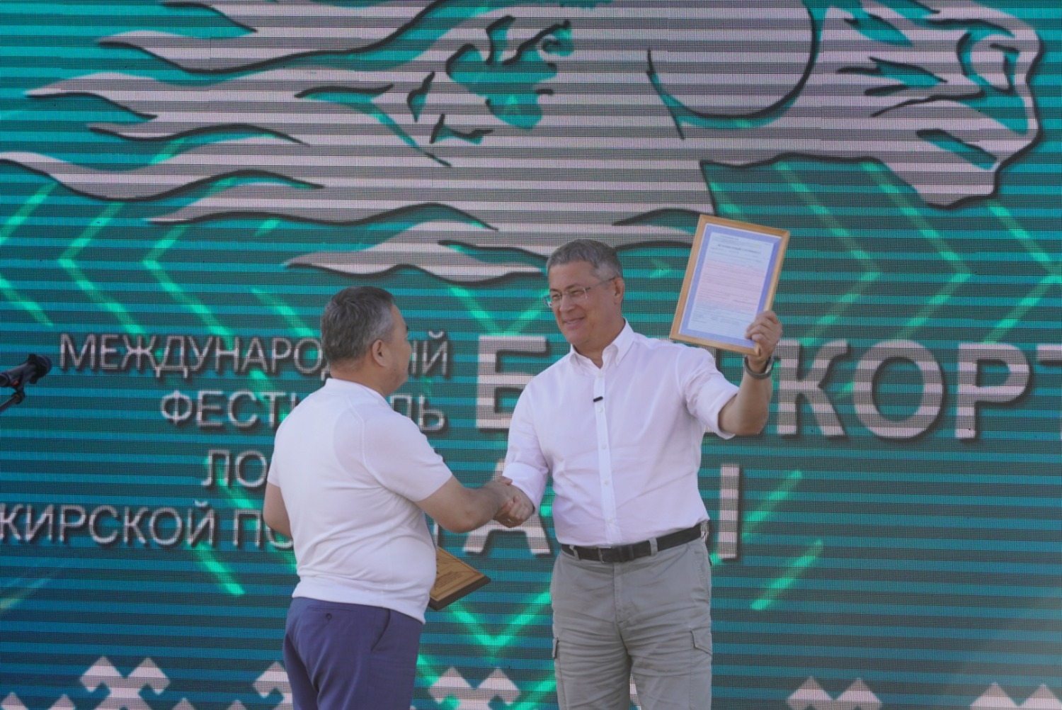 «Мы передаем вам огромный и пламенный привет. Фестиваль башкирской лошади нас очень сильно впечатлил», - сказал Мавр Абдуллин и передал Радию Хабирову сертификат на жеребца мугалжурской породы лошадей. Их отличает массивность, гармоничность телосложения, обладание крепкой конституцией и однотонная масть.