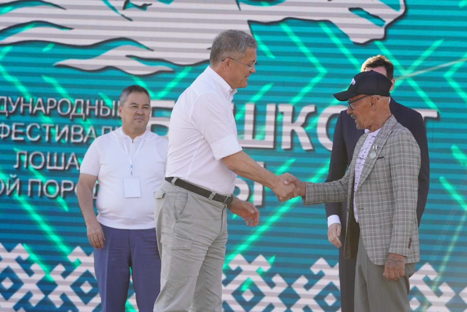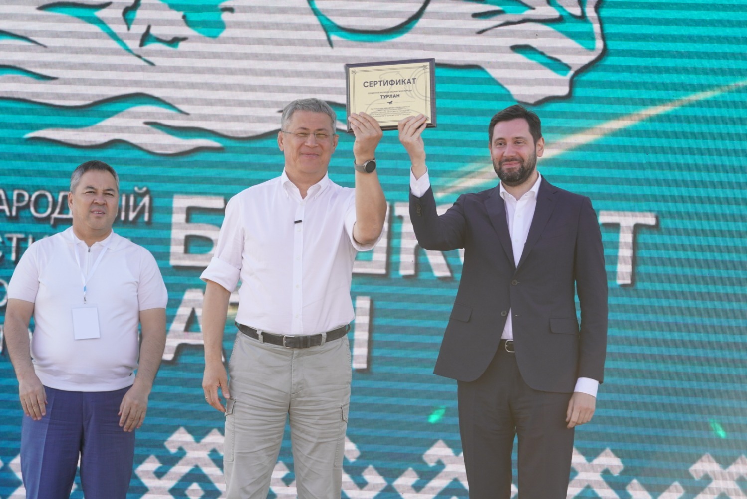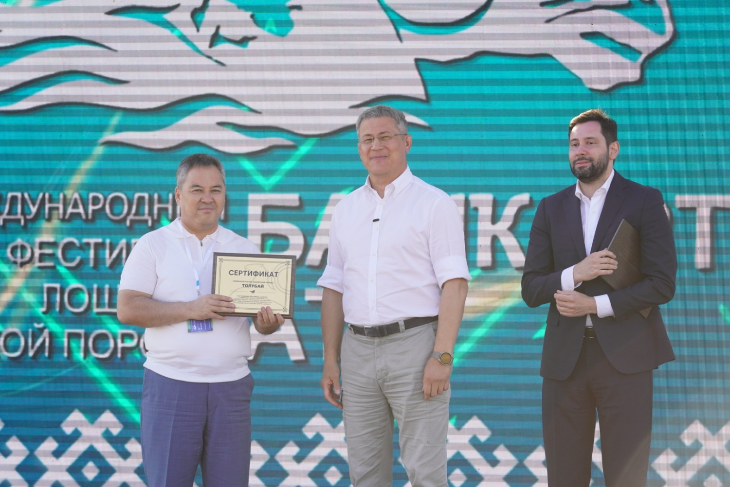 Радий Хабиров также передал сертификаты на породистых жеребцов башкирской породы руководителю федеральной службы по интеллектуальной собственности (Роспатент) Юрию Зубову и заместителю акима Актюбинской области Республики Казахстан Мавру Абдуллину.