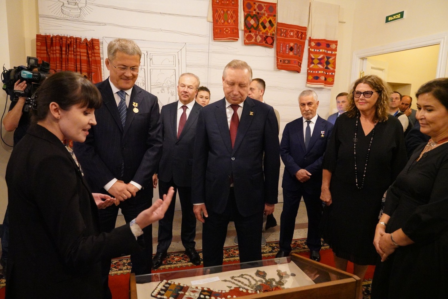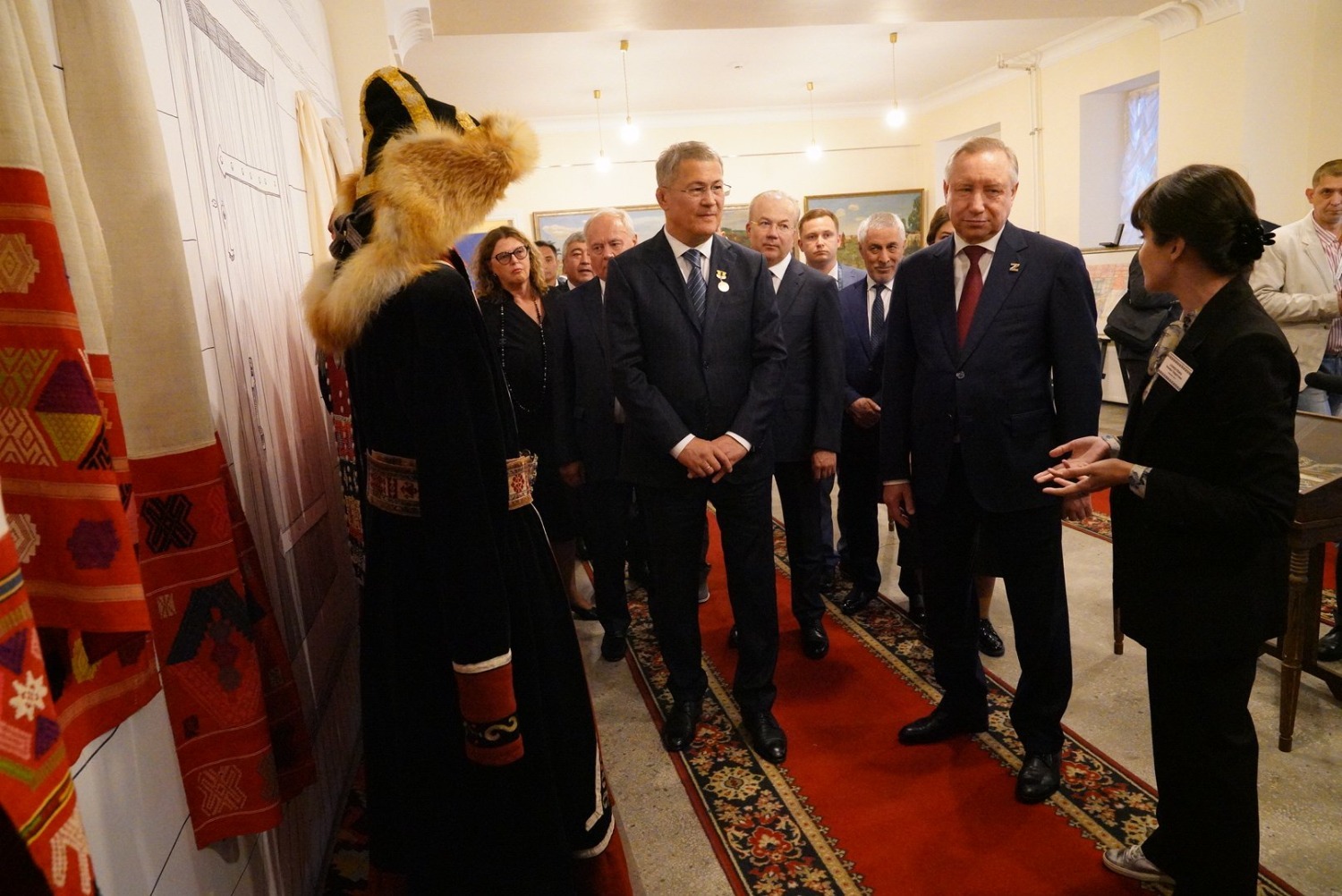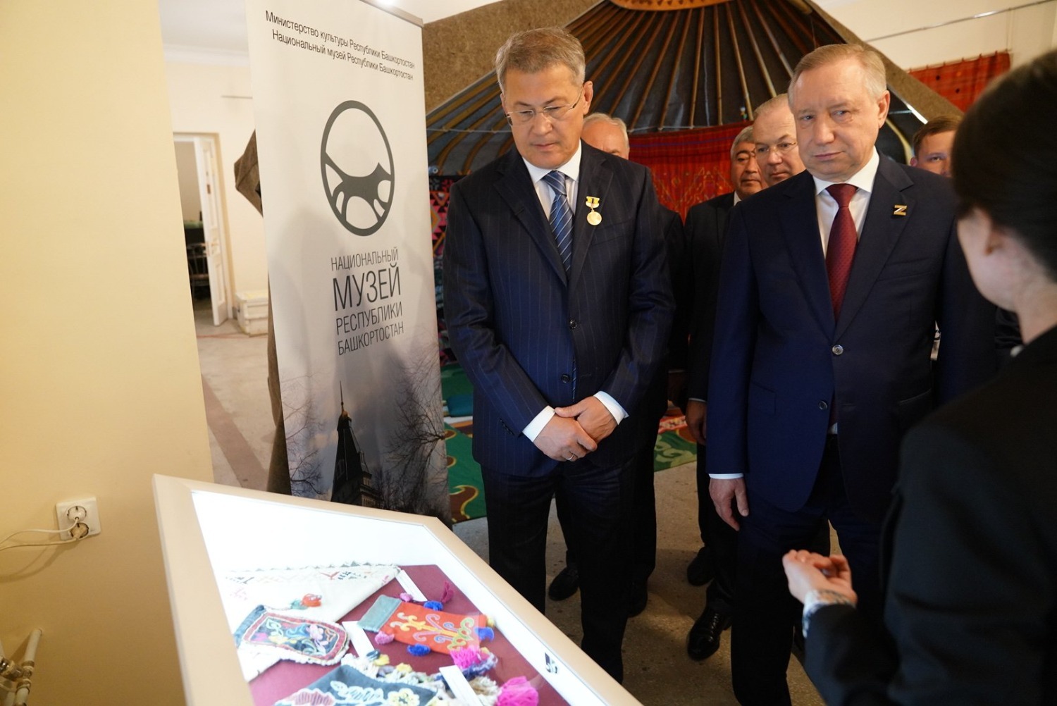 В экспозиции «В Сердце Евразии. Башкиры», которую представил Национальный музей Башкортостана, Радию Хабирову и Александру Беглову показали традиционное кочевое жилище башкир, национальный костюм башкирских женщин, секреты искусства тамбурной вышивки, узорного ткачества, ковроткачества, резьбы по дереву, изготовления музыкальных инструментов.