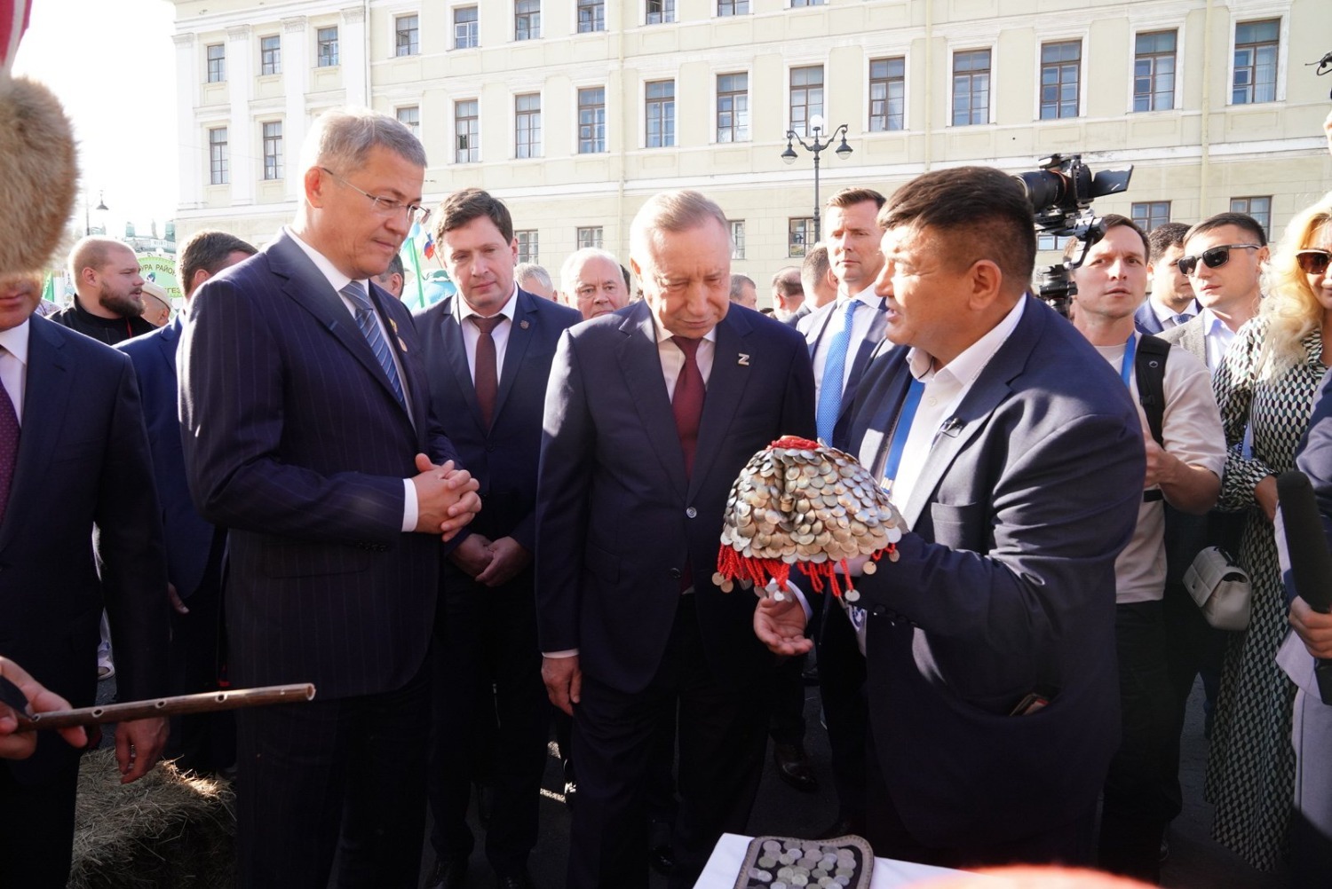 Сегодня в рамках Дней Башкортостана в Санкт-Петербурге Глава республики Радий Хабиров и губернатор Северной столицы Александр Беглов посетили локации республики, которые развернулись на Дворцовой площади и территории Государственной академической капеллы. Главам регионов показали, как башкиры добывают бортевой мед знаменитой бурзянской пчелы и изготавливают национальный музыкальный инструмент курай. Они также осмотрели 5 этнических юрт, презентующих культуру, кухню, быт башкирского народа из Белорецкого, Зианчуринского, Салаватского, Стерлибашевского, Стерлитамакского районов.