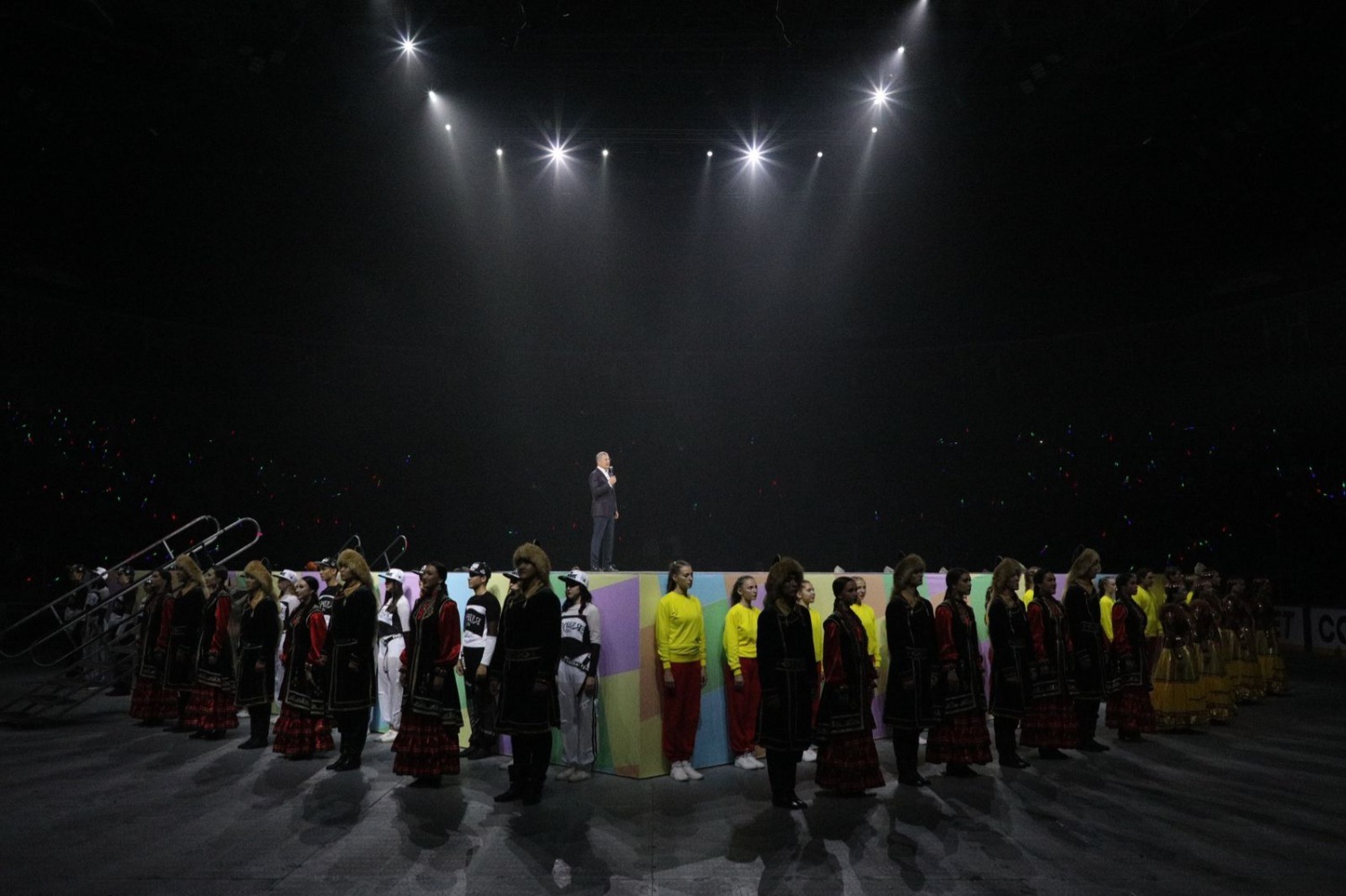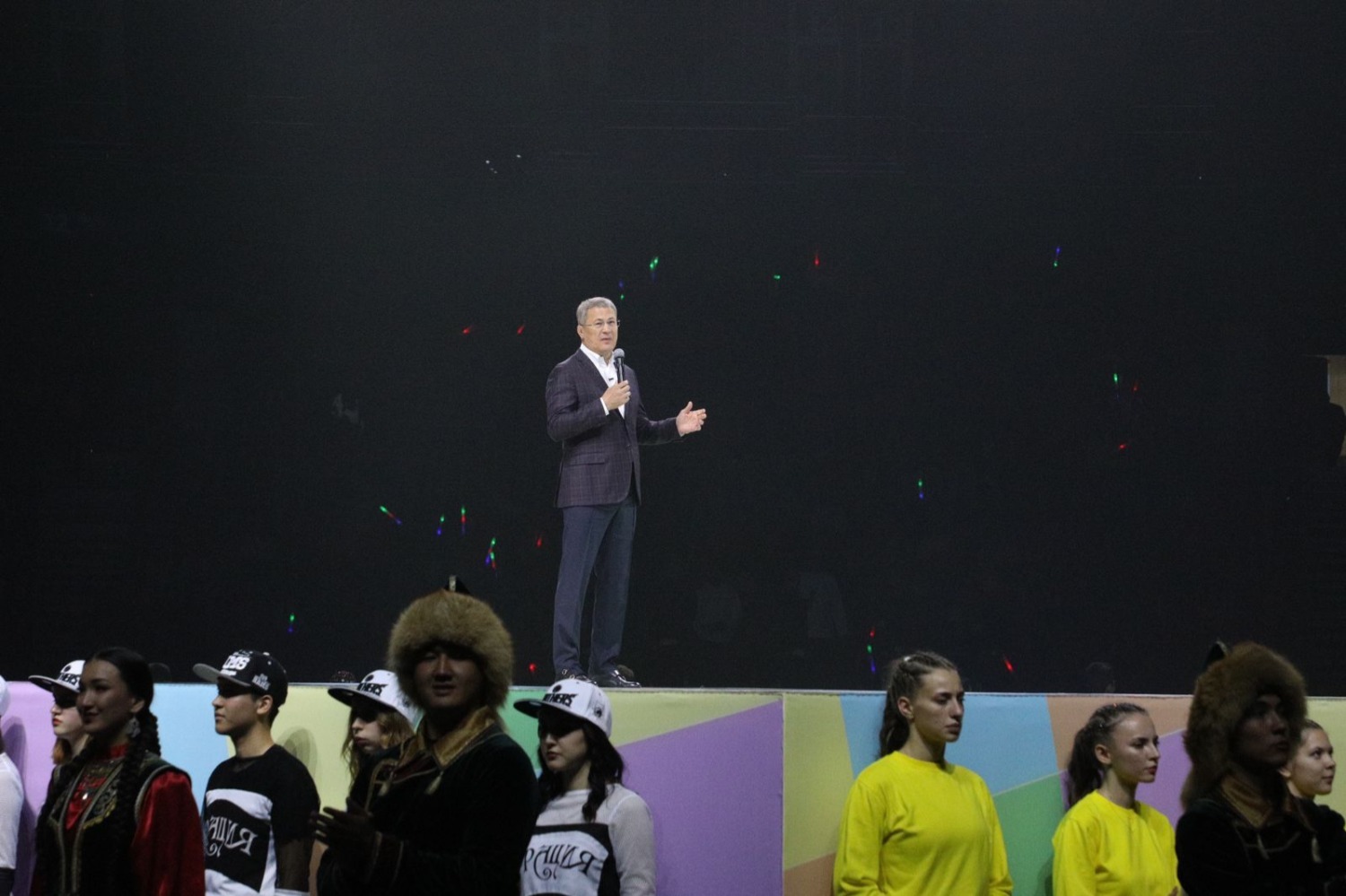«Добрый вечер, дорогие друзья! Добрый вечер, молодёжь! Прежде всего, я хочу вас всех сегодня поздравить с 1 сентября, началом нового учебного года! Пожелать вам удачи, успехов. И самое главное, зачем я сюда сегодня к вам пришёл, – сказать, что вы самая лучшая молодёжь на свете. Вы сильные, вы талантливые, вы упорные, и всё у вас в жизни получится. Придёт когда-то время, и вы, и ваше поколение будете отвечать за развитие нашего родного Башкортостана. А пока моё поколение двигает республику вперёд. Я очень хочу, чтобы здесь, в нашей родной республике хотелось жить, учиться, работать. Это действительно большое счастье – жить и работать у себя дома, на Родине. И сегодня я хочу пожелать всего самого доброго, быть такими же талантливыми, как те ребята, которые здесь выступали, быть мудрыми и добрыми, как наш дорогой соотечественник, великий человек и поэт Мустай Карим, быть мужественными, как генерал Шаймуратов и тысячи наших парней, которые бьются за нашу страну на специальной военной операции. И, конечно же, быть такими же бесстрашными, как наши хоккеисты «Салавата Юлаева», которые здесь в этом году будут биться за Кубок Гагарина. У нас в республике есть замечательный девиз: «Алға, Башкирия! Вперёд, Башкортостан!» - сказал Радий Хабиров.