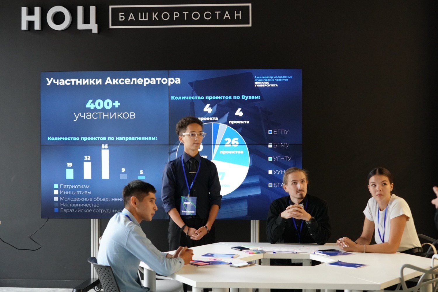 Менеджер проекта центра программной деятельности управляющей компании научно-образовательного центра Башкортостана Анна Ершова пояснила, что в прошлом году был проведен трехнедельный интенсивный акселератор молодежных студенческих проектов, который объединил 390 участников из 5 вузов Евразийского НОЦ – УУНиТ, УГНТУ, БашГАУ, БГМУ, БГПУ им. М. Акмуллы.