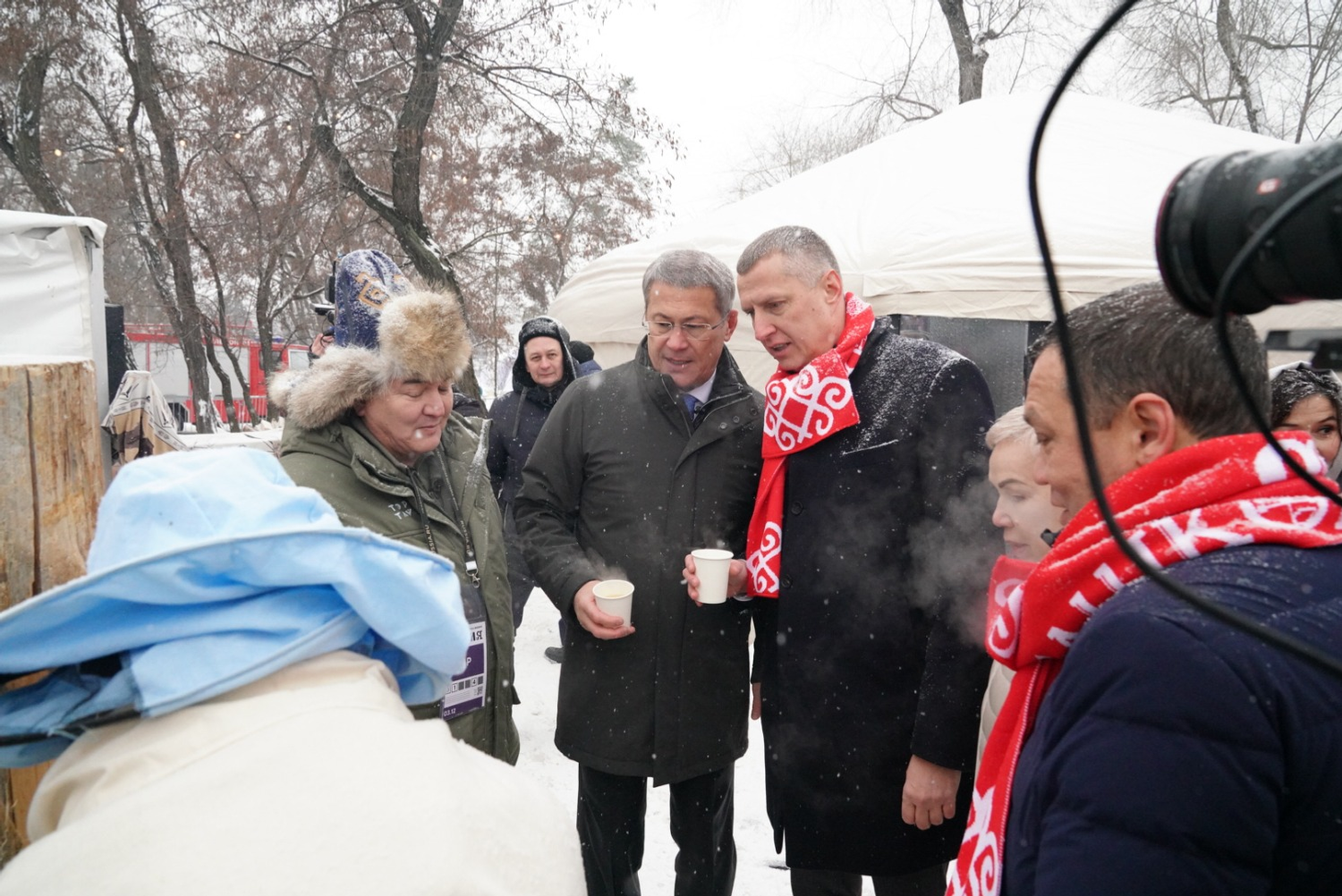 Глава республики Радий Хабиров осмотрел уличный дворик Башкортостана, где на протяжении всего дня проходят фестивали «Терра Башкортостан» и «Терра Зима». Руководитель республики осмотрел выставку, где представлены башкирский мед, фитопродукция, изделия республиканских ремесленников. Здесь же работает выставка самоваров. Радий Хабиров также снял с новогоднего дерева открытку с пожеланиями участников акции «Елка желаний».