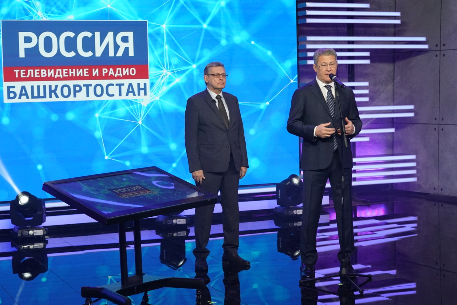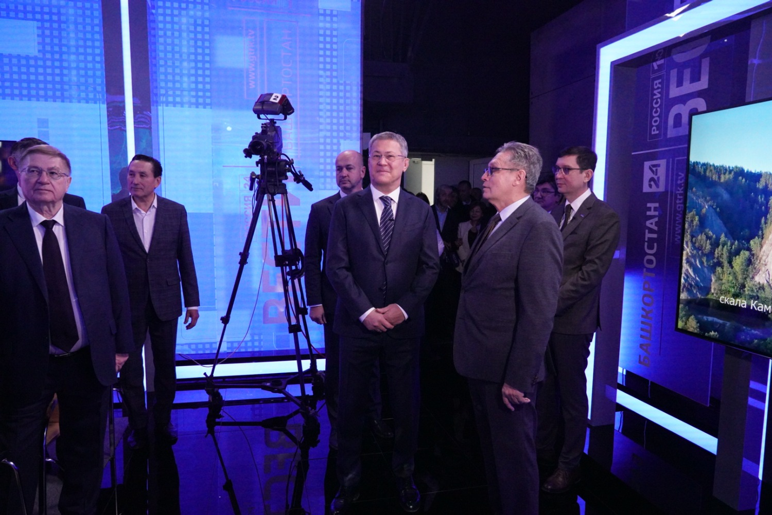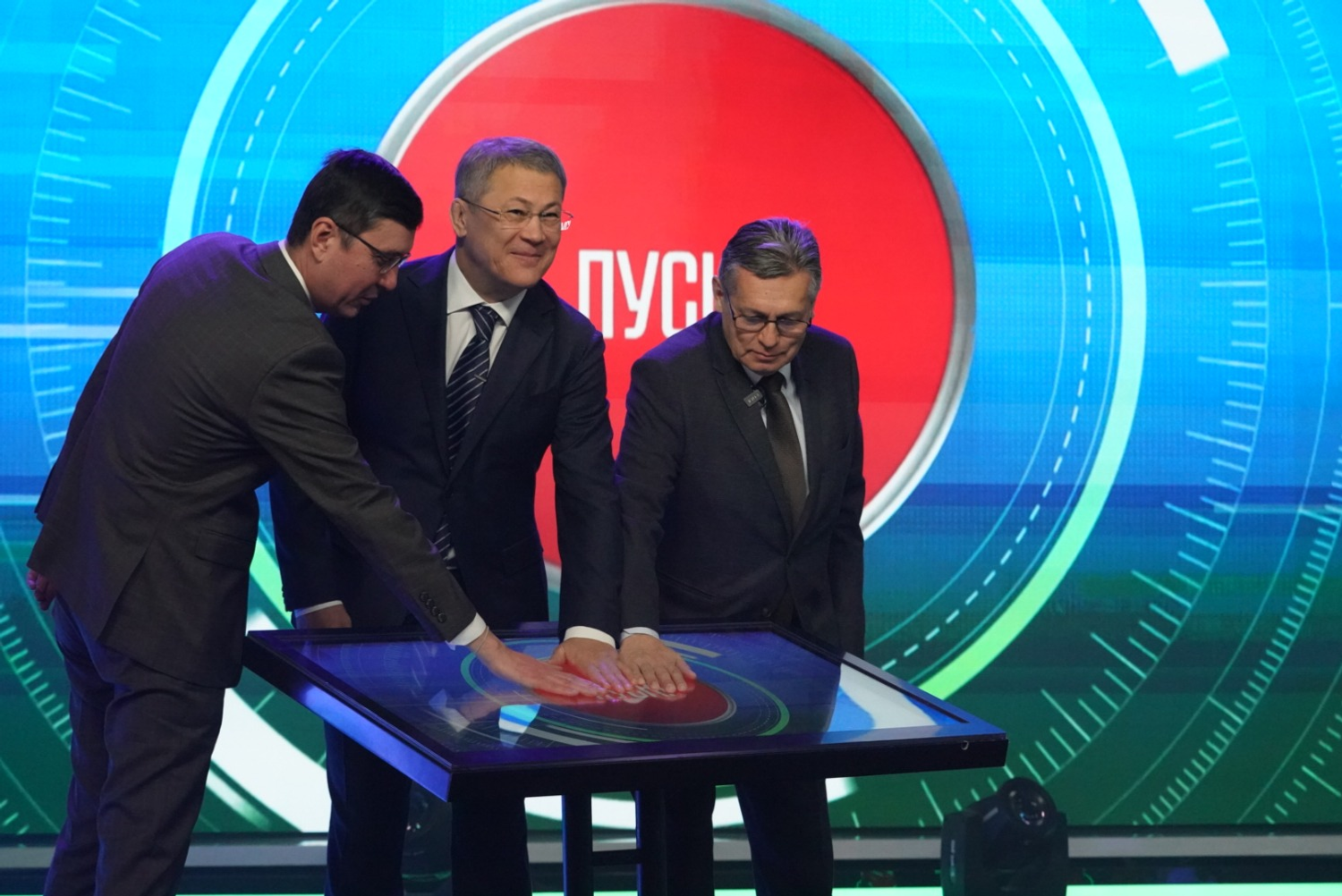 Глава Башкортостана, заместитель генерального директора ВГТРК и директор ГТРК «Башкортостан» Азамат Салихов нажали символическую кнопку, тем самым дав старт работе обновленной студии.