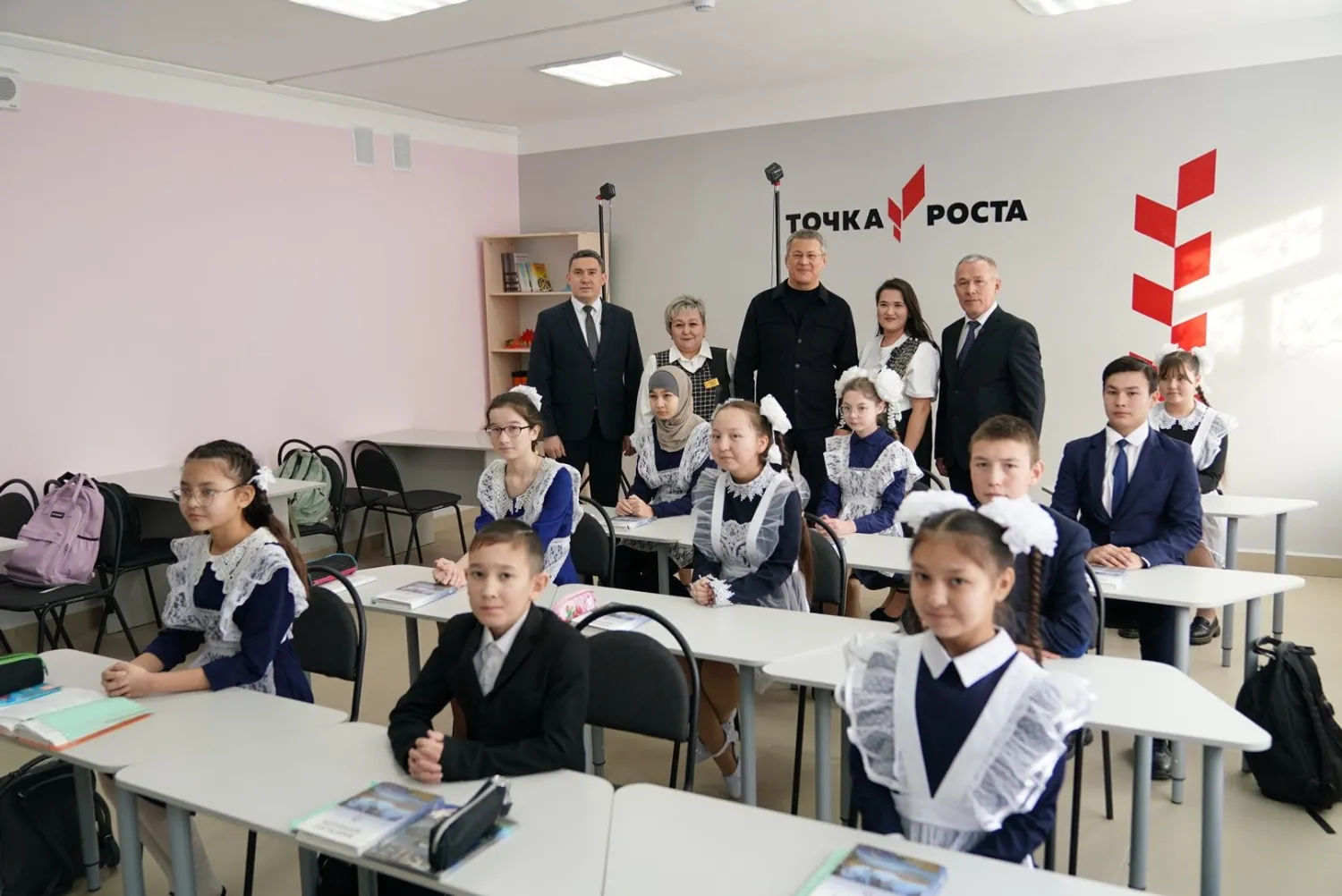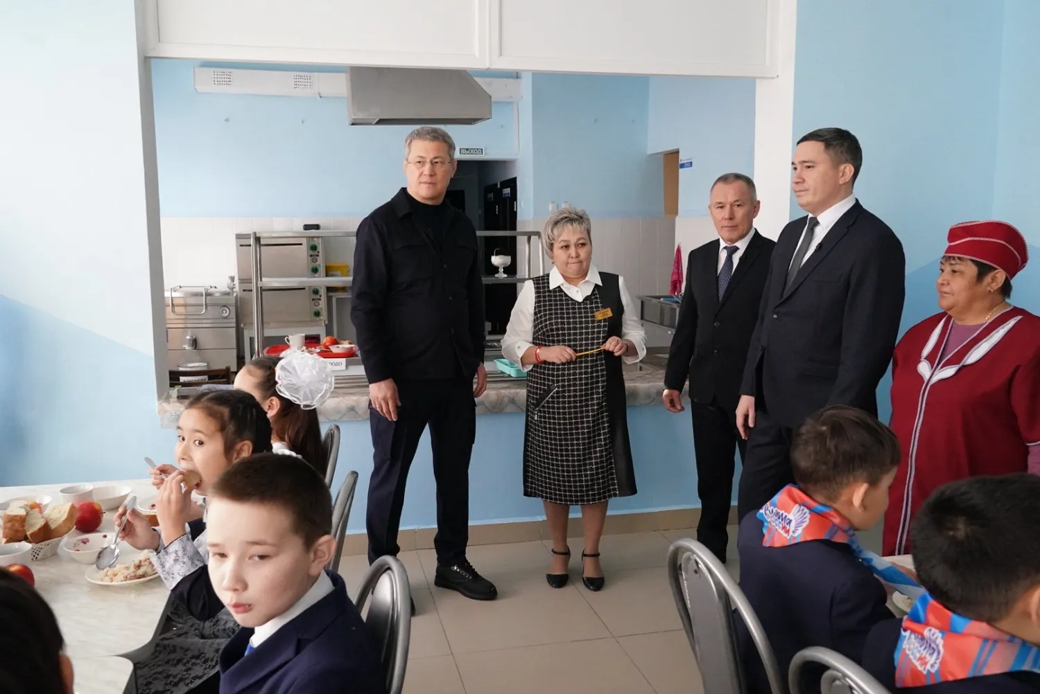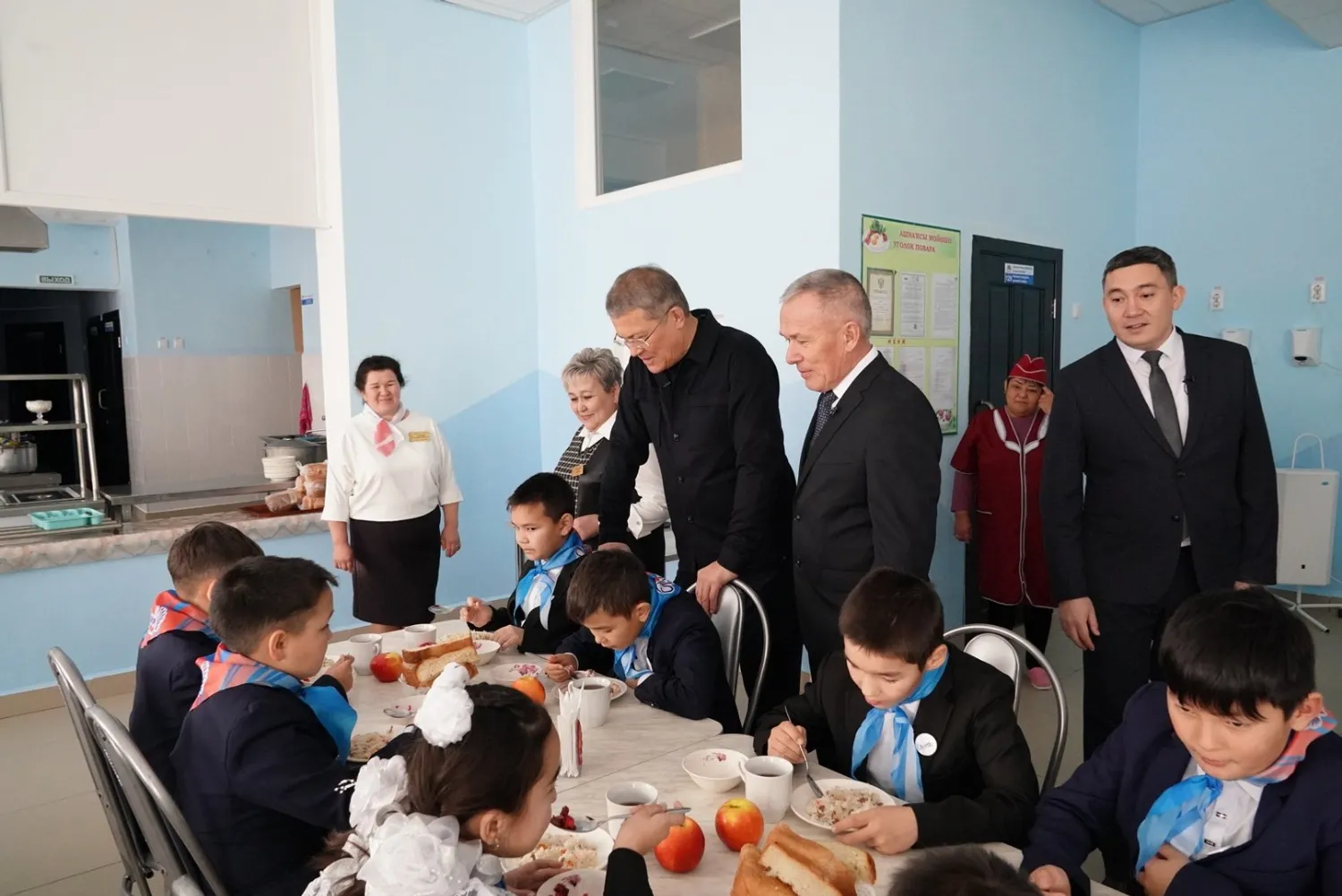Радий Хабиров осмотрел несколько учебных кабинетов, спортзал и столовую и также посмотрел церемонию принятия местных школьников в организацию «Орлята России».