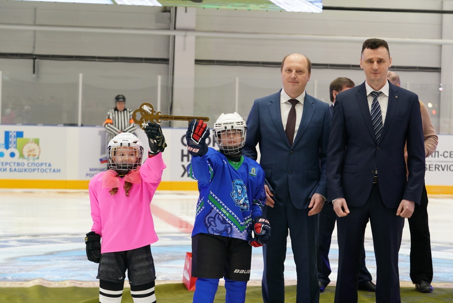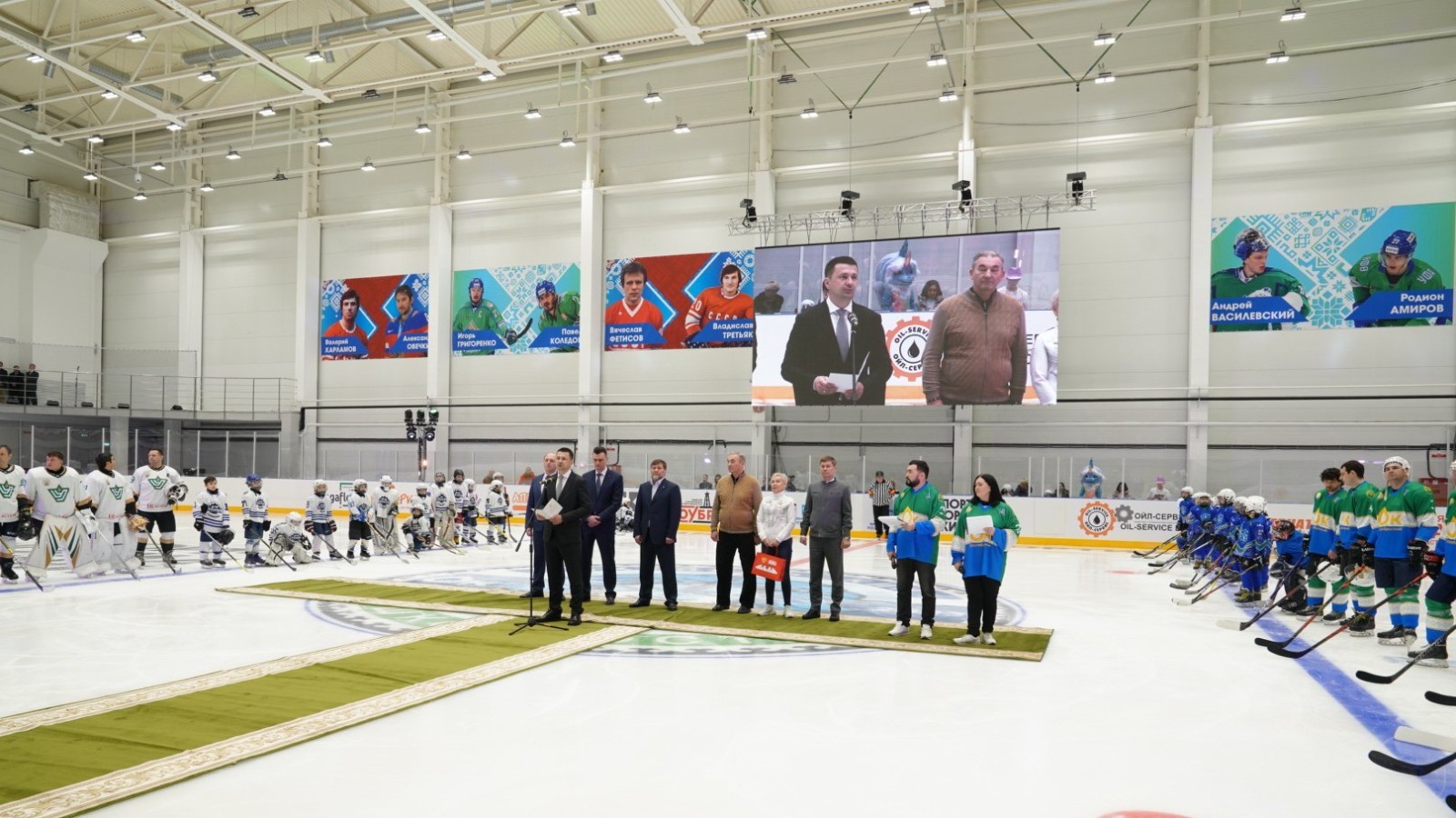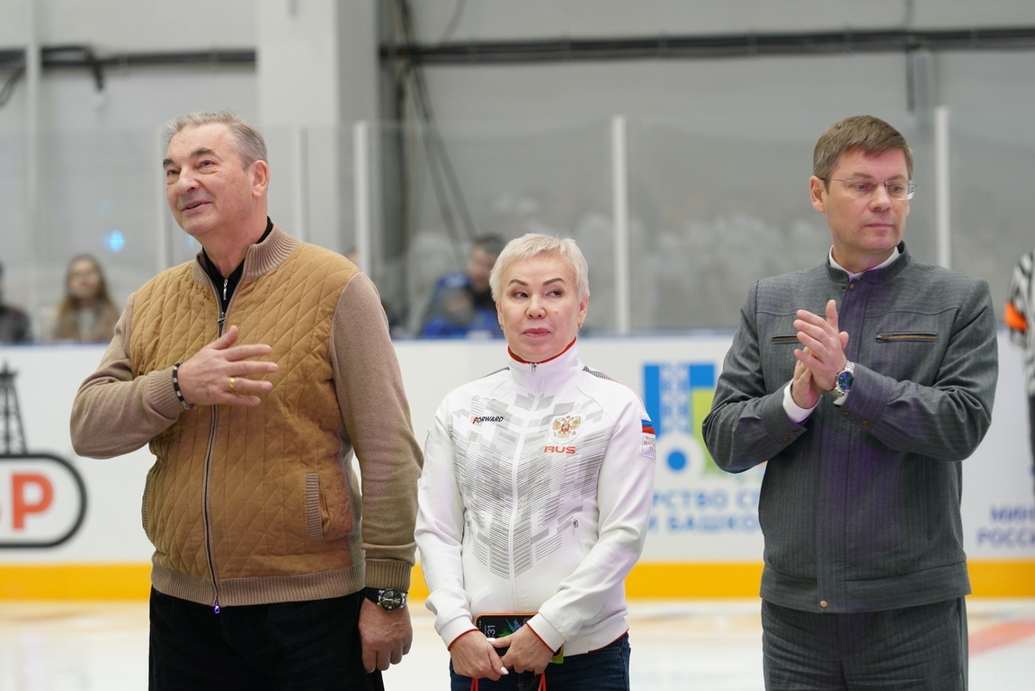 «От имени наших жителей республики, от имени Главы Республики Башкортостан, Правительства мы сегодня открываем в Октябрьском нашу замечательную Ледовую арену. Поздравляю всех вас с этим прекрасным новогодним подарком! Мы благодарим за поддержку наших инициатив заместителя министра спорта России Одеса Хасаевича Байсултанова и президента Федерации хоккея, трехкратного олимпийского чемпиона, легендарного Владислава Александровича Третьяка. Спасибо вам большое! С вашей помощью мы решаем задачу, поставленную президентом нашей страны – создать условия для занятий спортом и укрепления здоровья каждого россиянина. Важный объект для города и республики построен в рамках большой программы, которую реализует ПАО «Роснефть», ПАО «Башнефть», «Роснефть – детям». И мы благодарны за поддержку, которую нам оказывает «Роснефть» и «Башнефть», за развитие спорта, социальной инфраструктуры в нашей республике.