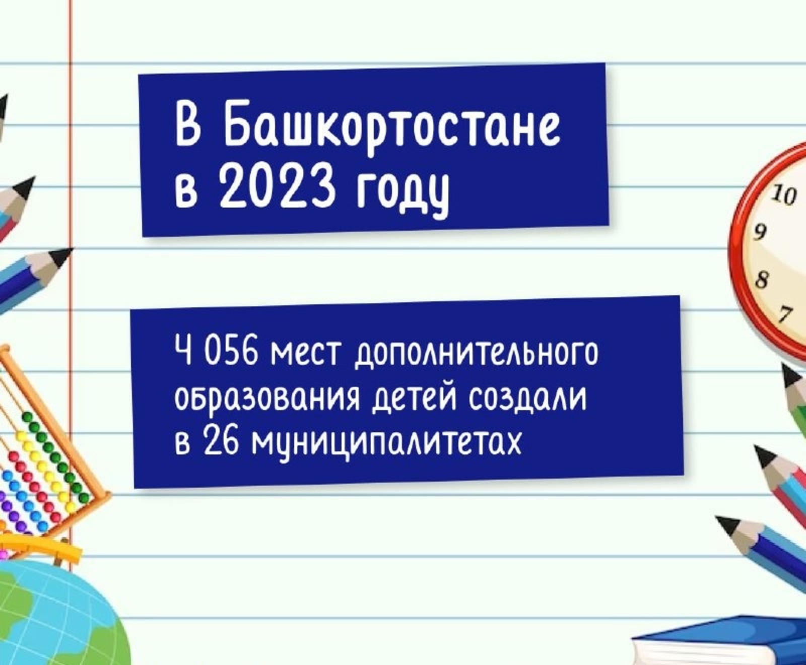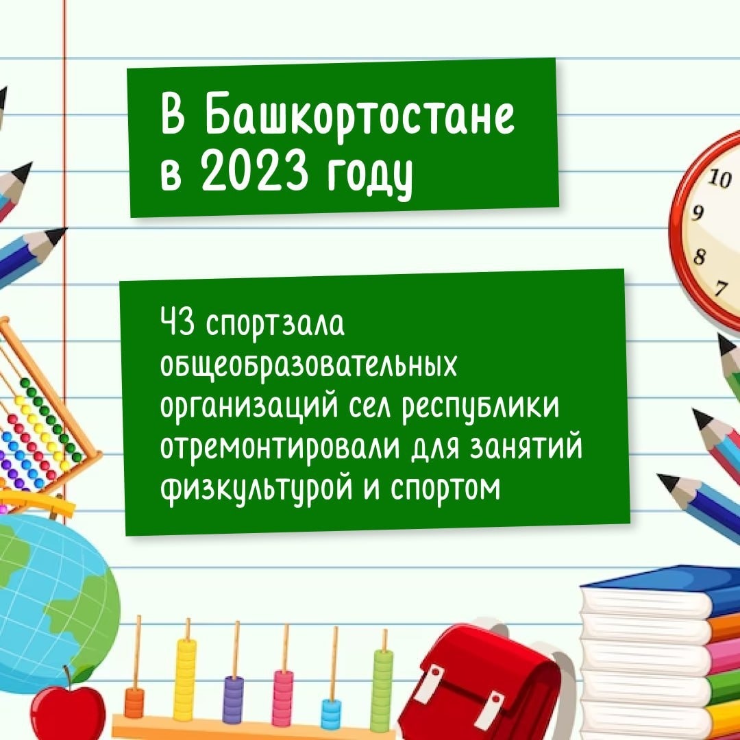 Также в Башкортостане создали 4056 мест дополнительного образования детей в 26 муниципалитетах, отремонтировали 43 спортзала общеобразовательных организаций сел республики для занятий физкультурой и спортом, оснастили 5 открытых плоскостных спортивных сооружений спортивным инвентарем и оборудованием, 41 школу оснастили комплектами цифрового оборудования.