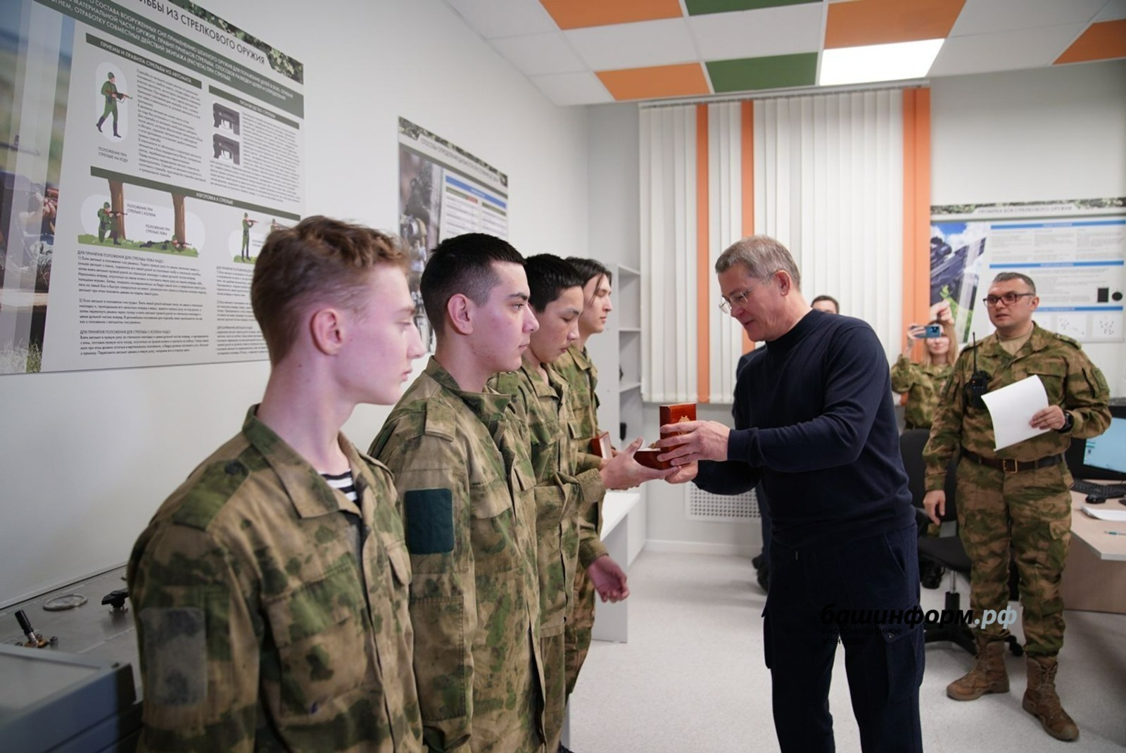 Радий Хабиров познакомился с курсантами, которые, по словам наставников, показали в первые дни сборов меткую стрельбу. Тимур Тангатаров, Рушан Абулаев, Мирас Казакбаев и Матвей Чирков решили подтвердить свою меткость ещё раз, когда их об этом попросил Радий Хабиров. Однако ребята волновались, поскольку за стрельбой следил Глава Республики Башкортостан, и выбили от 85 до 87 очков из ста, хотя ранее их результат не опускался ниже 95.
