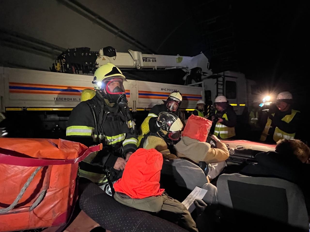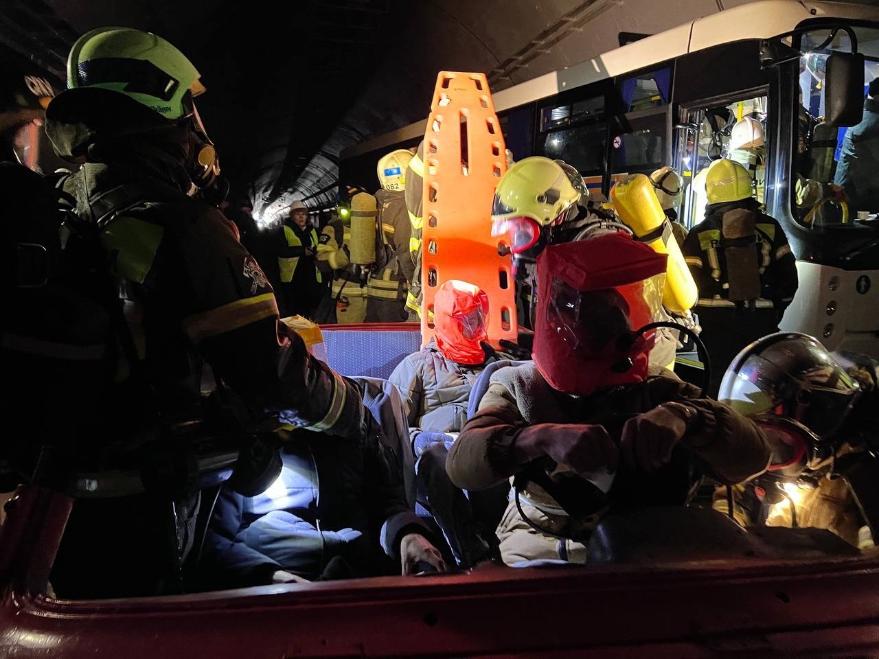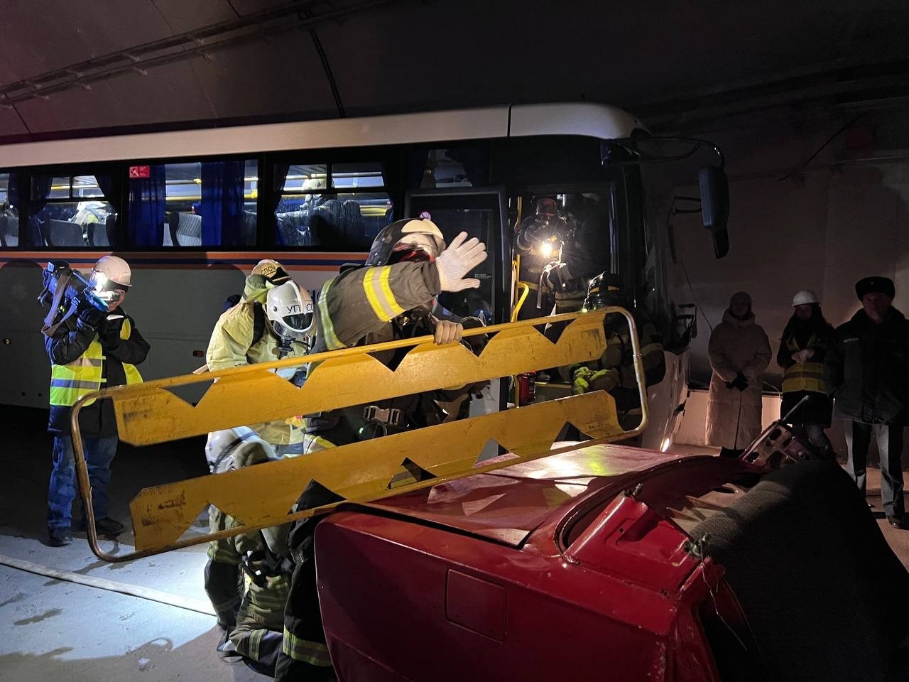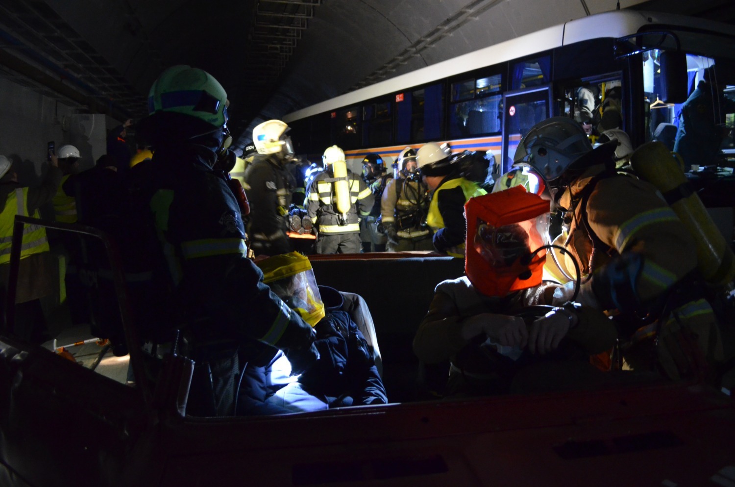 По легенде, в центральной части тоннеля столкнулись легковой и грузовой автомобили, а также рейсовый автобус. Произошел розлив топлива, возник пожар. Еще одно ДТП случилось в другой части тоннеля - загорелся легковой автомобиль. В автобусе «в ловушке» оказались 31 человек. В легковых и грузовых машинах зажало пятерых человек – все без сознания.