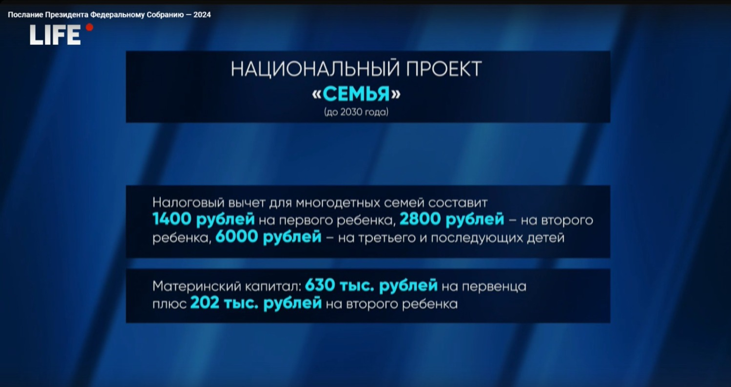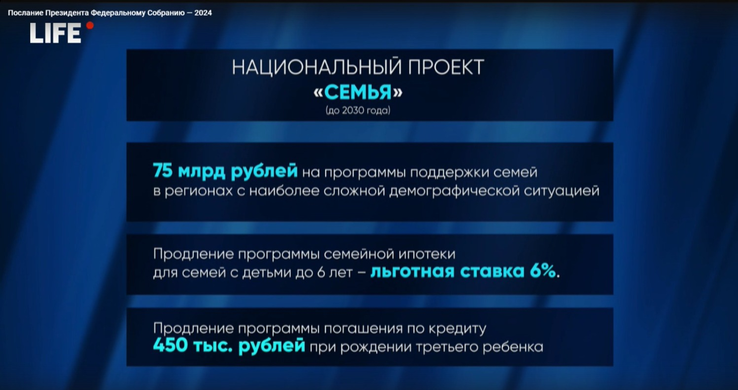 «Российские регионы реализуют свои меры поддержки семей с детьми. Предлагаю помочь регионам, где уровень рождаемости ниже среднего. Направим до 2030 года таким регионам не менее 75 млрд рублей», — сказал президент.