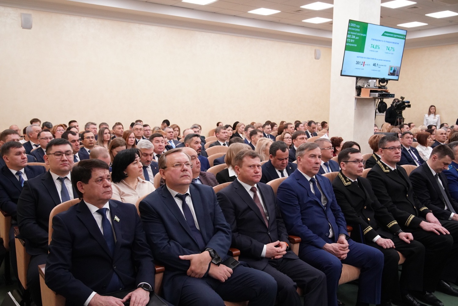 «Ежегодно судьи республики рассматривают значительное число дел. Только в прошлом году – 1 миллион 336 тысяч. По суммарной служебной нагрузке – 90 дел в месяц на одного судью – наши районные суды на третьем месте в стране и на втором – в Приволжском федеральном округе. При этом от качества рассмотрения каждого дела зависит судьба человека, его вера в законность и справедливость. Высока нагрузка и у мировых судей – за прошлый год ими рассмотрено почти миллион гражданских, уголовных, административных дел и материалов. Важно, что вы активно внедряете в судопроизводстве цифровые технологии. Использование видеосвязи, веб-конференции, возможность обращения в суд через электронную систему «Правосудие» – всё это эффективные инструменты для оперативного рассмотрения дел, сокращения нагрузки судей, реализации права на судебную защиту», - отметил Радий Хабиров.