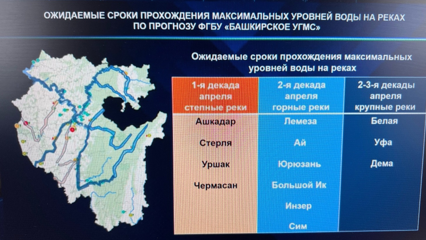 «На текущей и следующей неделе ожидается сохранение высоких уровней воды на горных реках и рост уровня воды на крупных реках - Белой, Уфе, Деме. В настоящее время водохранилища республики работают в режиме наполнения, до полного наполнения на Павловском водохранилище необходимо 8,5 м, Нугушском +12 м, в Юмагузинском +31,4 м», — доложил он.